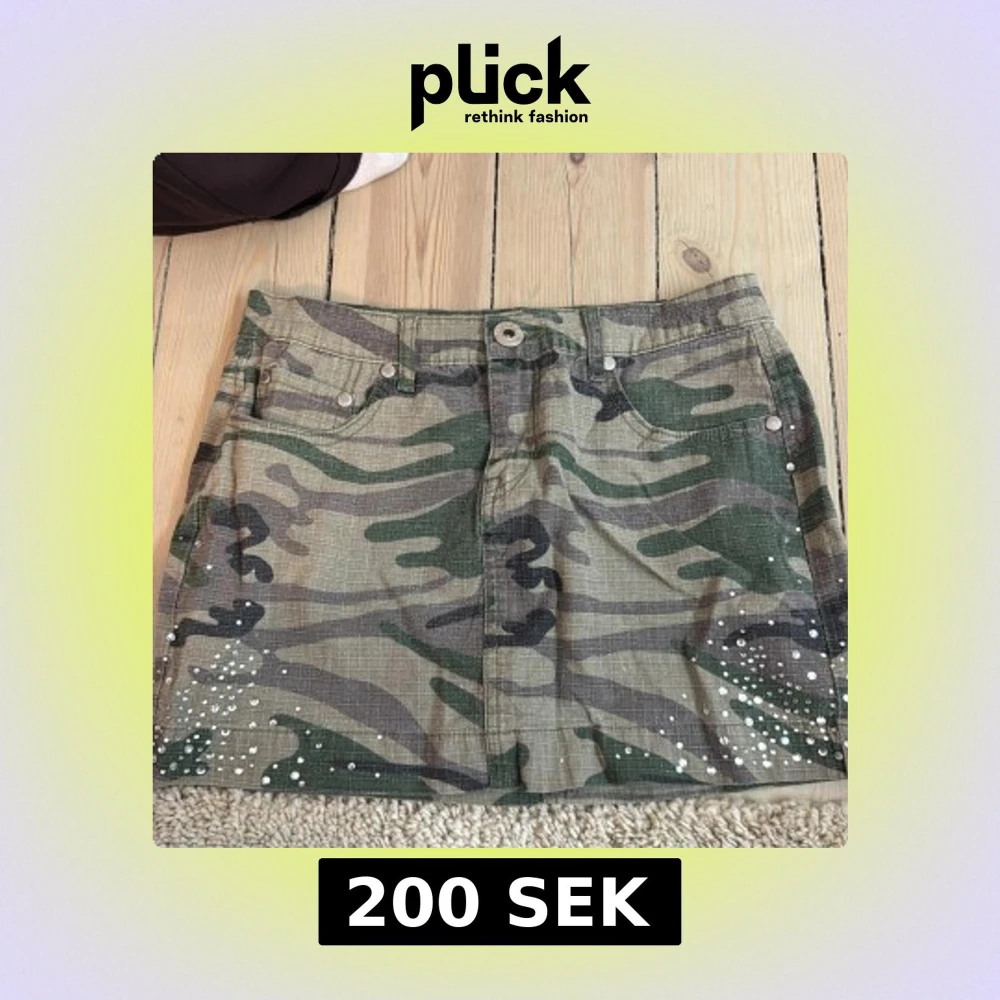 Cool camouflagemönstrad minikjol med vita pärlor längs nederkanten och bakfickorna. Kjolen har klassisk jeansmodell med fickor fram och bak 💕💕💕💞
