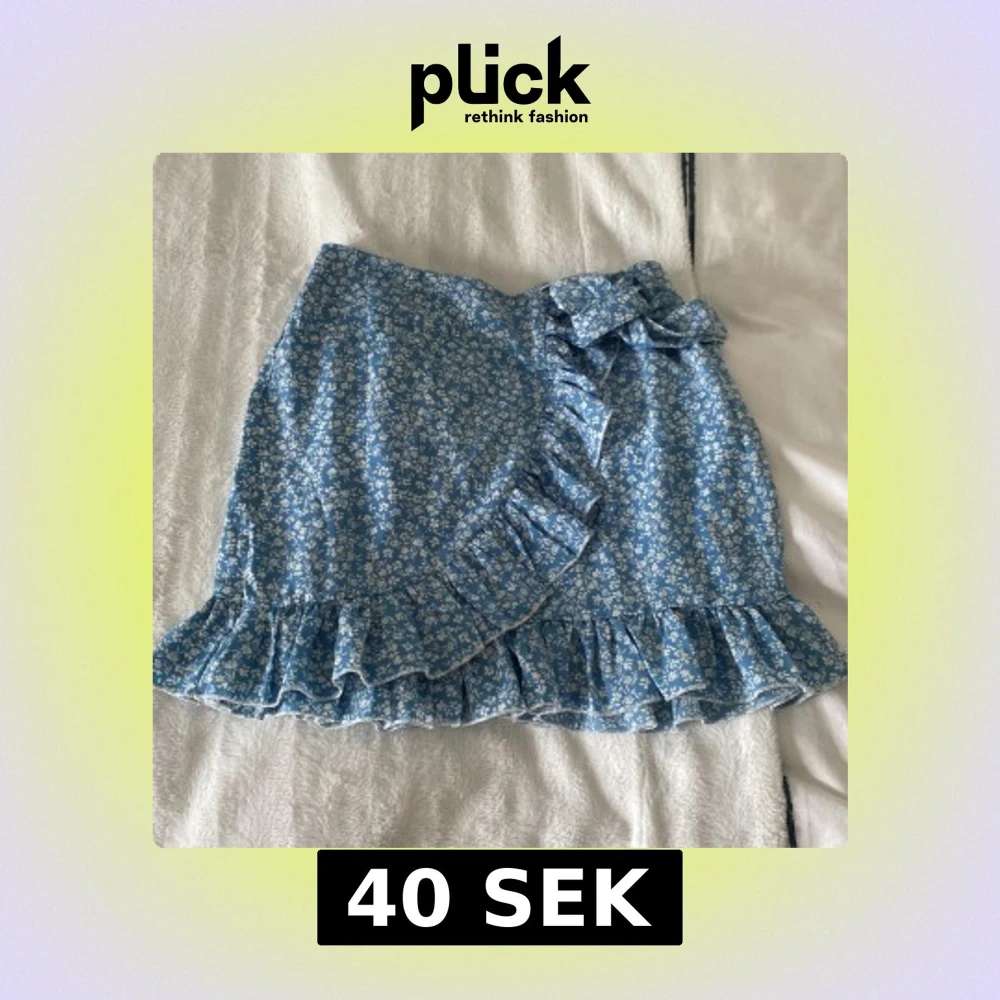 Supersöt blå omlottkjol från SHEIN med vitt blommönster, volangkant och en dekorativ rosett i midjan. Kjolen har dragkedja i sidan och är perfekt för vår och sommar.