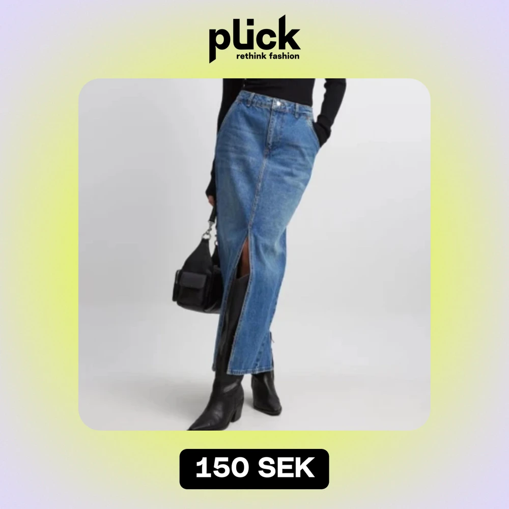 En lång blå jeanskjol med hög midja och slits framtill och baktill. Kjolen har en klassisk femficksdesign och stängs med dragkedja och knapp.