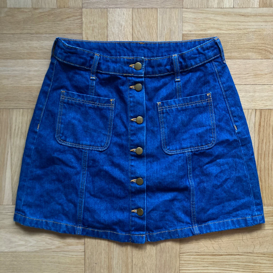 Blå jeanskjol från H&M Divided med snygga fickor och knappar framtill. 100% bomull så både bekväm och hållbar!