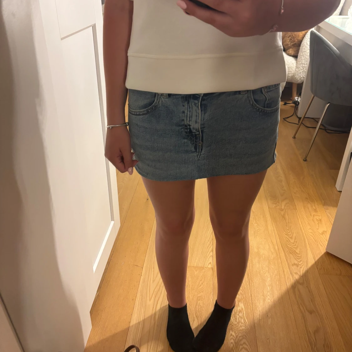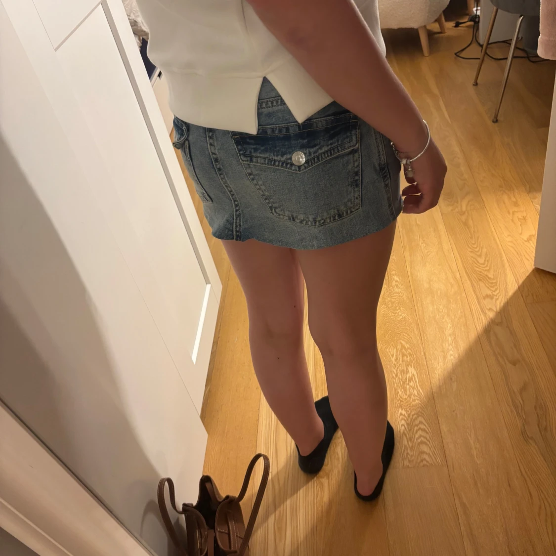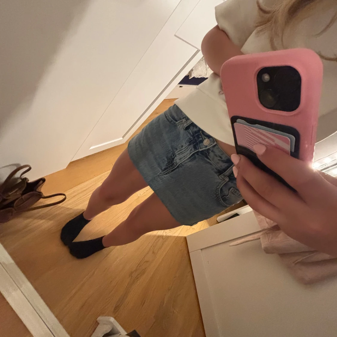 Säljer en klassisk blå jeanskjol i kort modell med fem fickor och knapp- samt dragkedjestängning framtill. Priset går att diskutera! ❤️