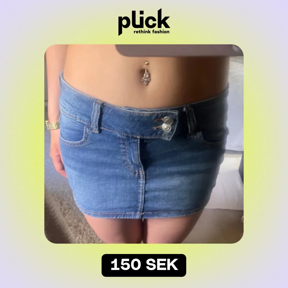 En kort blå jeanskjol med två framfickor och två bakfickor. Kjolen har en knapp- och dragkedjestängning framtill.