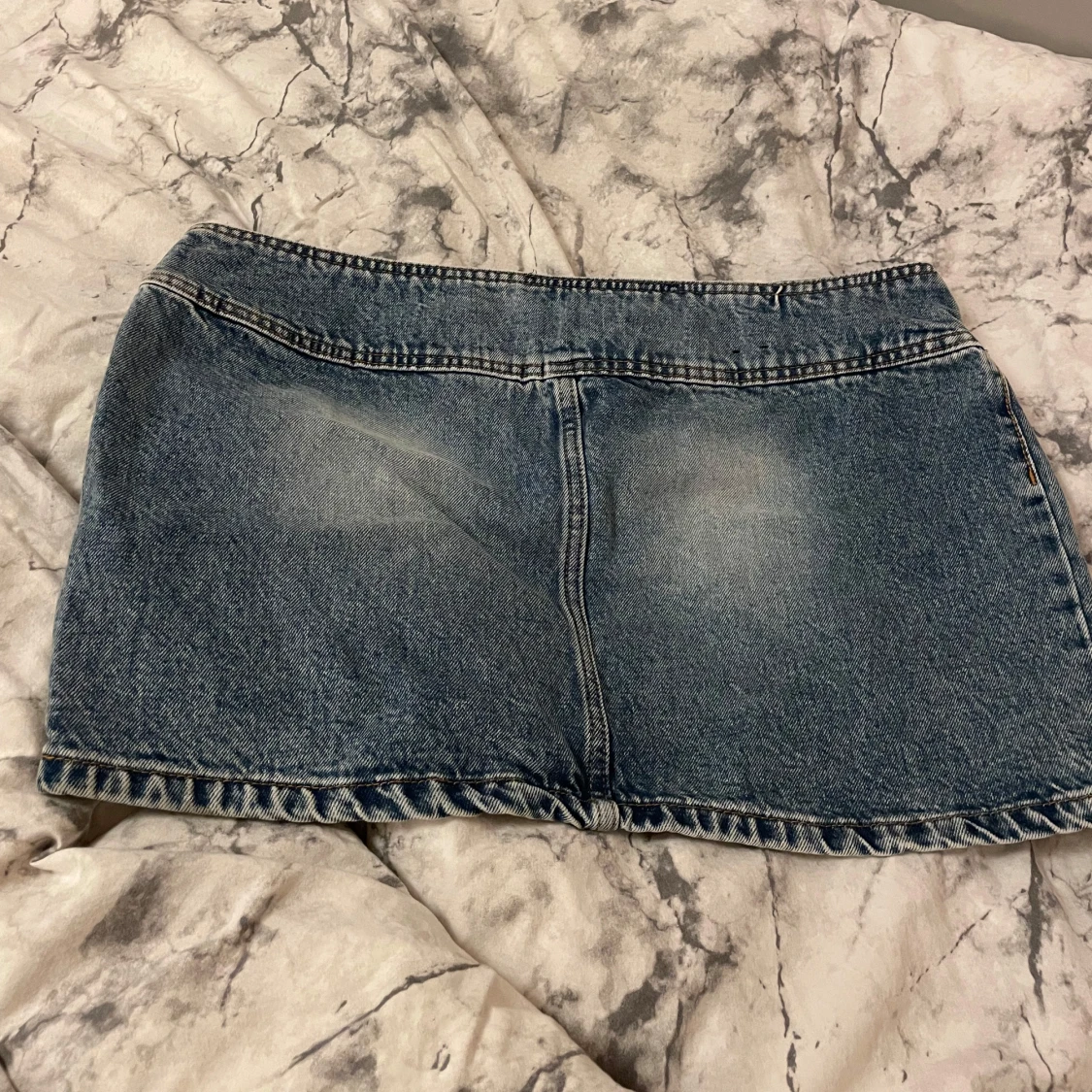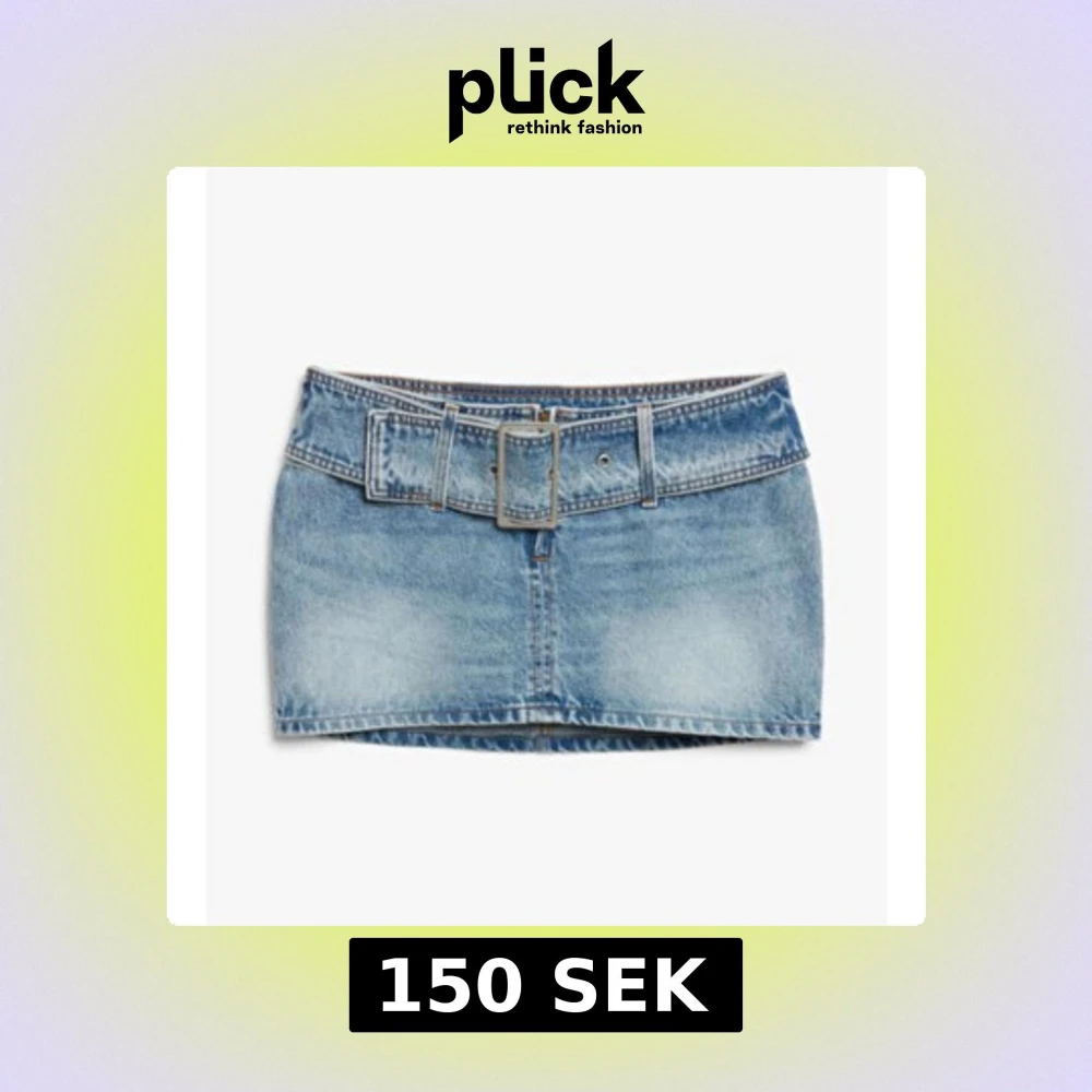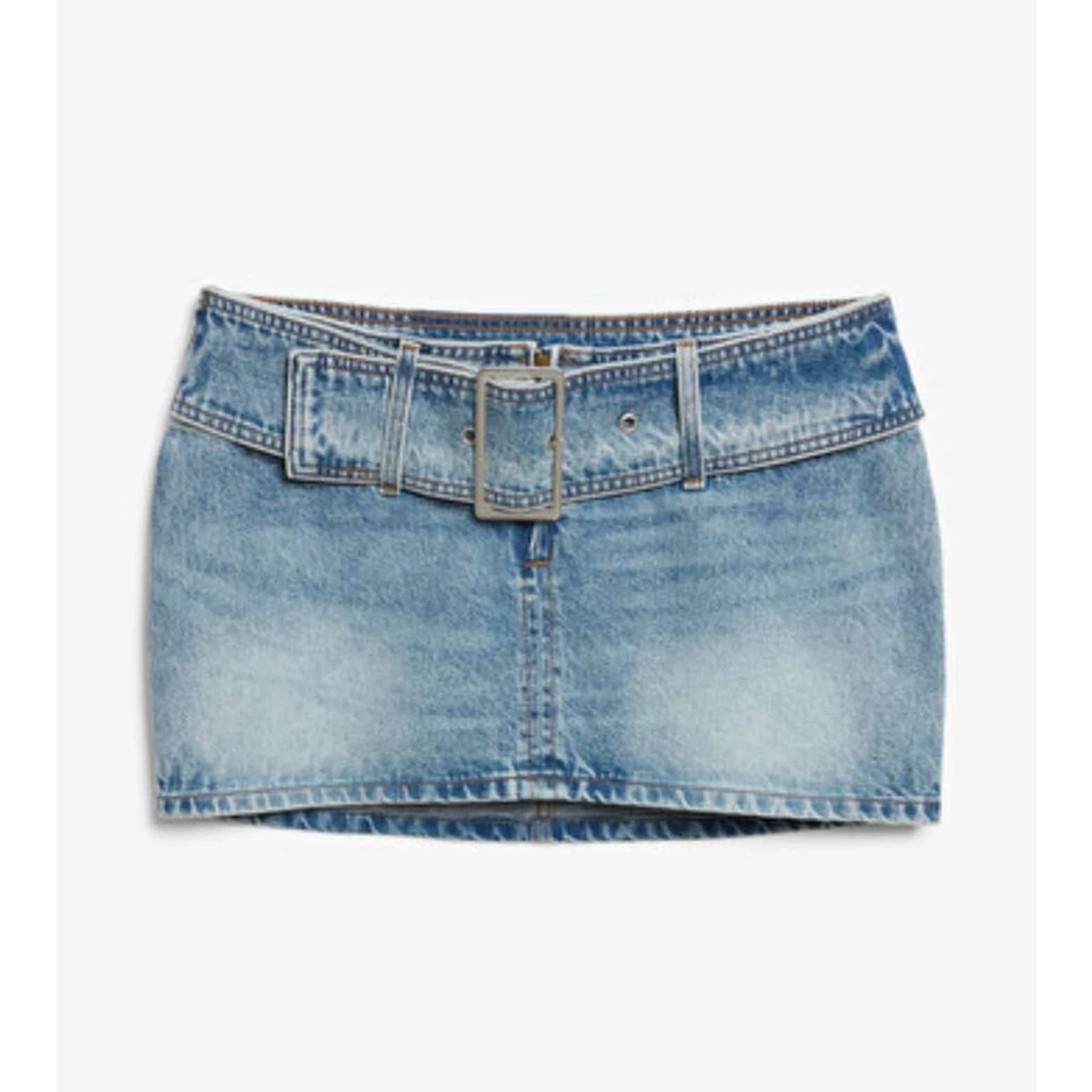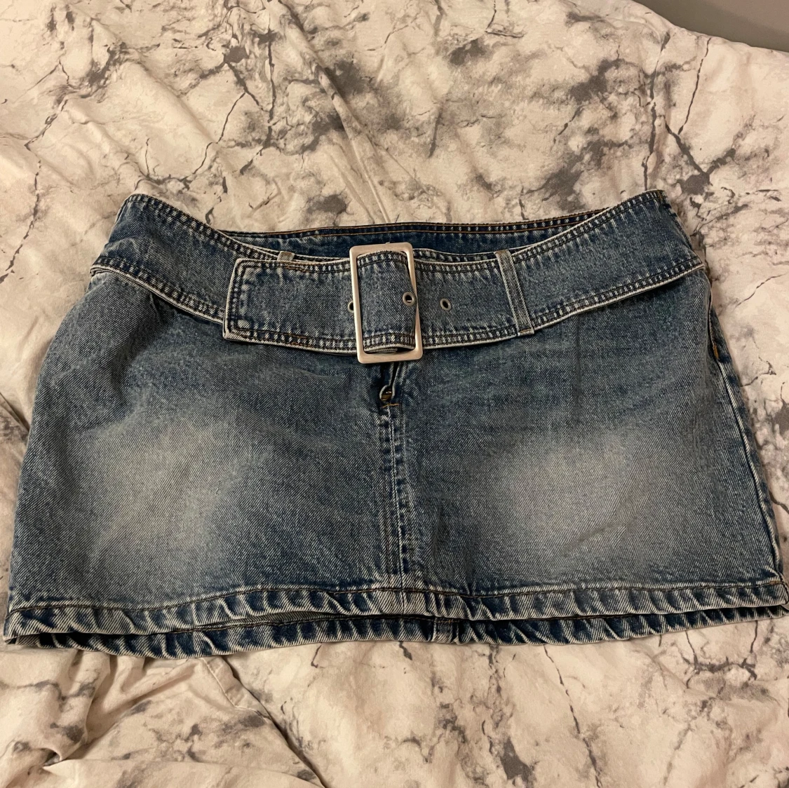 Trendig blå jeanskjol med ett brett bälte och spänne i midjan. Kjolen har en kort längd och en klassisk denimlook med ljusa tvättade detaljer. Aldrig använd då den inte är min stil