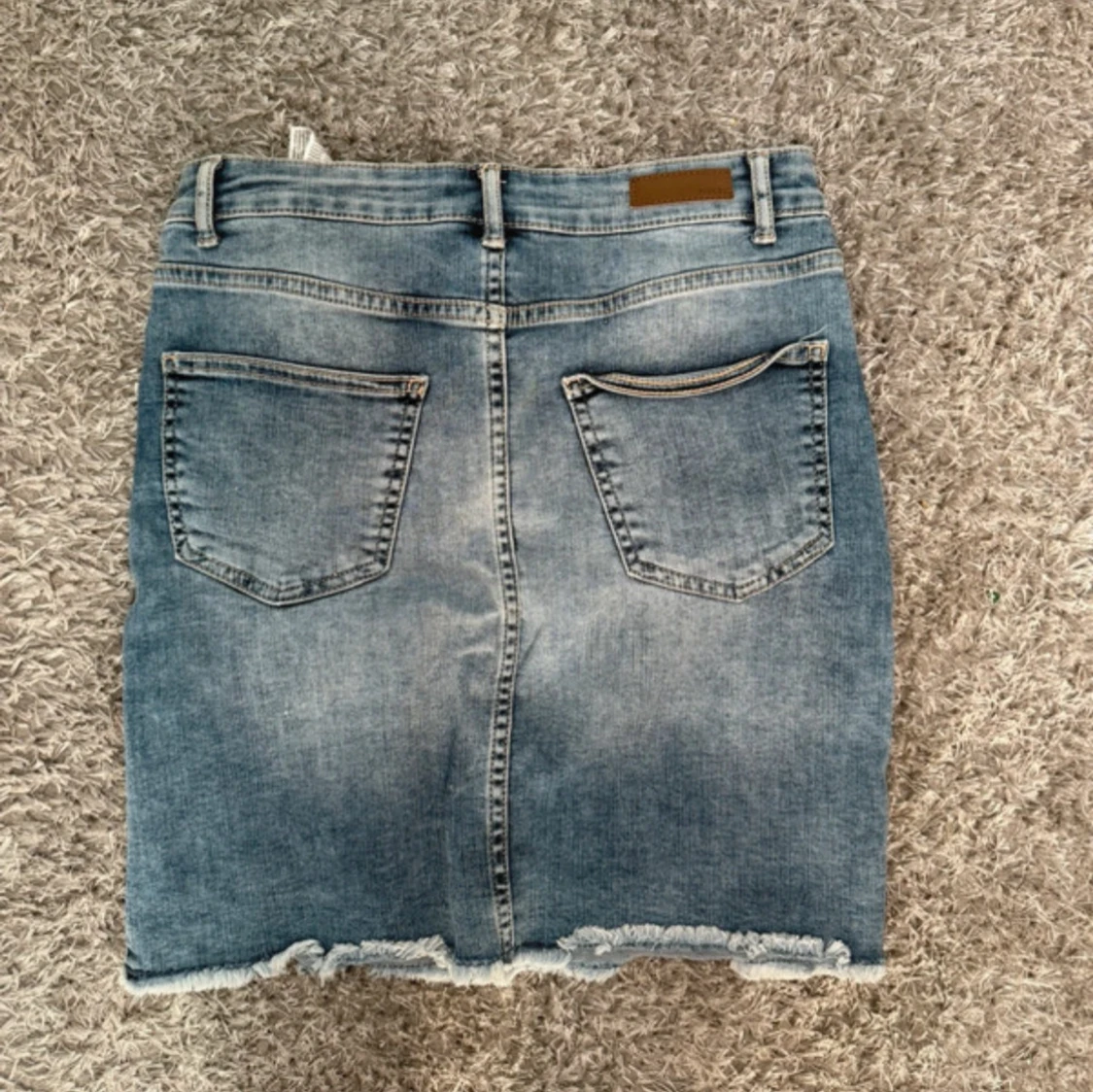 Säljer en blå jeanskjol med fransad kant och klassiska fickor både fram och bak. Kjolen har bälteshällor, knapp och dragkedja framtill. Den är i en kort modell och har en snygg tvättad look som ger en chill vibe.