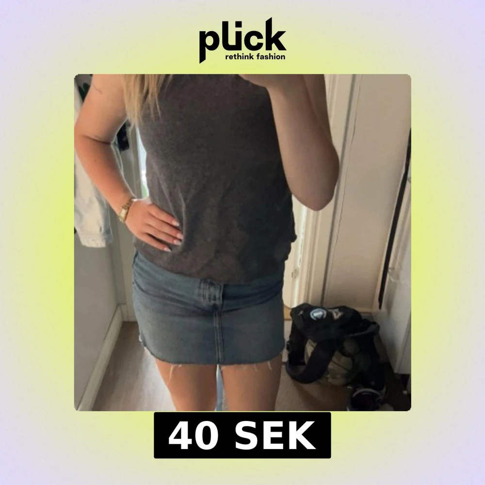 Säljer en blå jeanskjol från 157 med klassisk femficksdesign och fransig, rå nederkant. Kjolen är kort och har bälteshällor samt knapp spänning