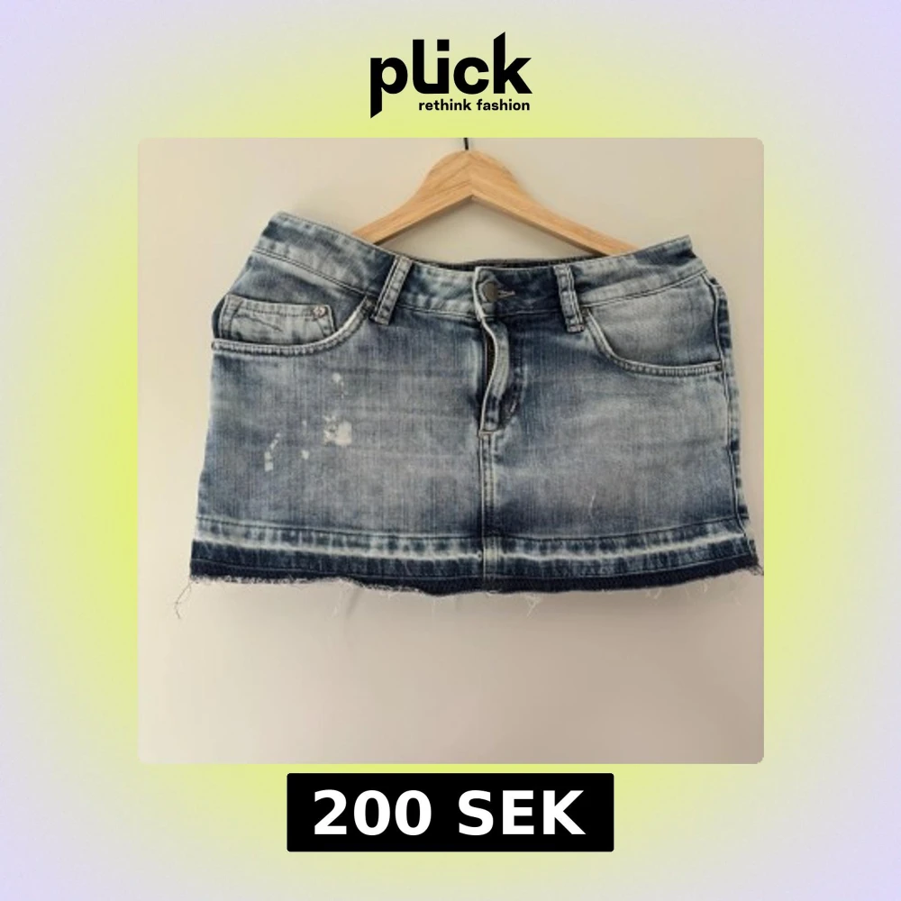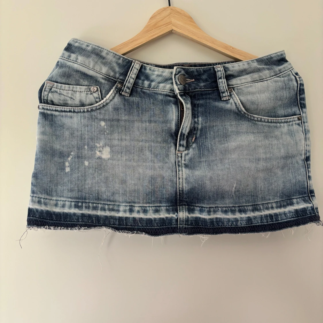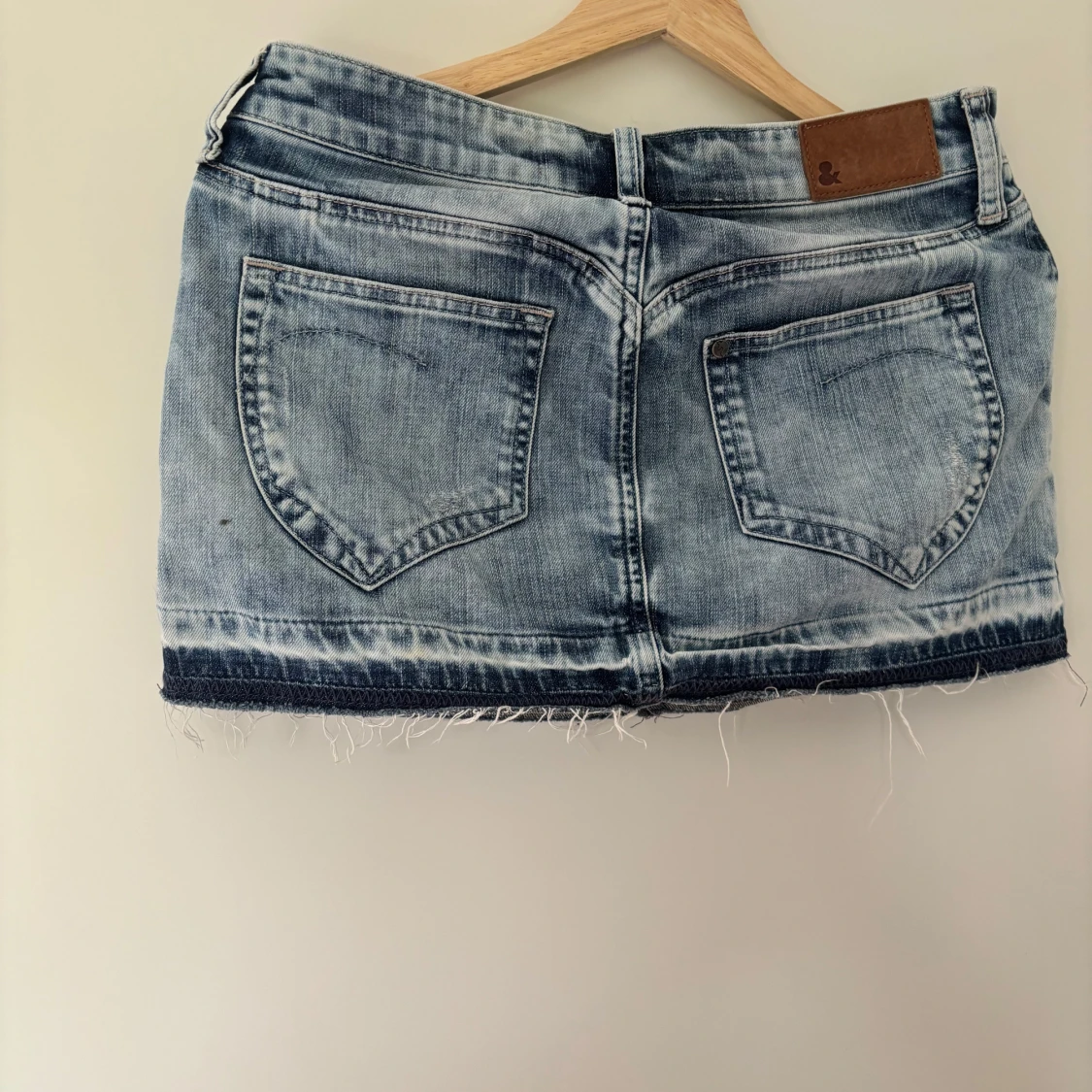 Snygg blå jeanskjol med slitna detaljer och fransig, rå kant nertill.