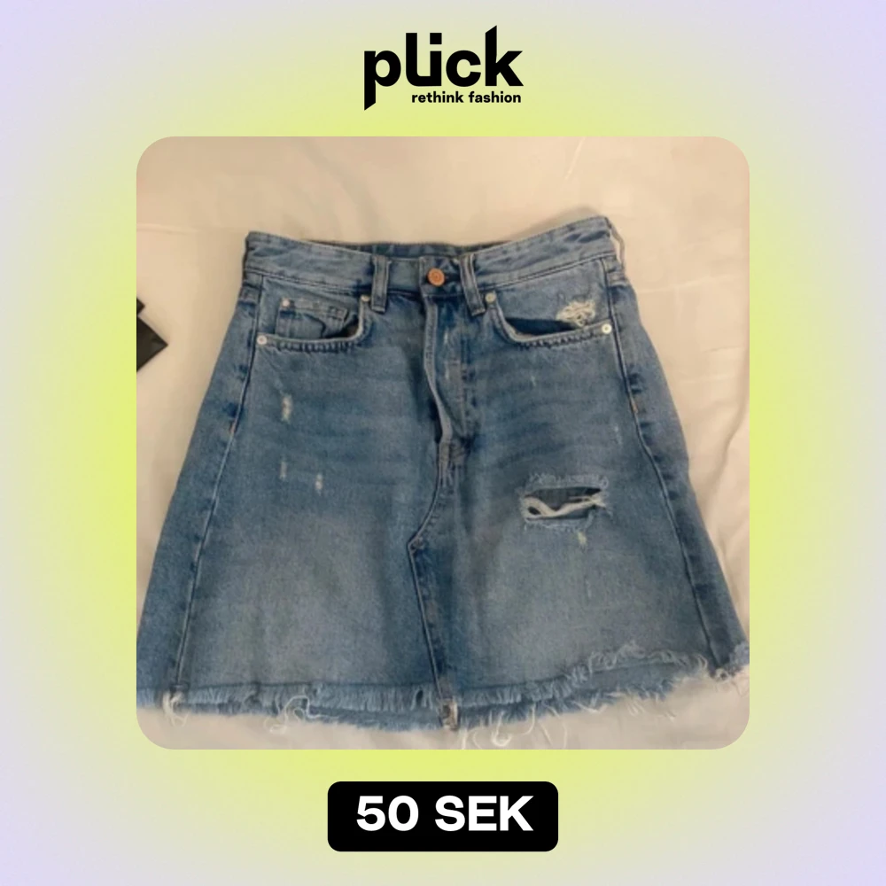 Säljer en blå jeanskjol med slitningar och fransig kant. Perfekt för en avslappnad look! Kjolen har klassiska fem fickor och en knappstängning fram. Passar perfekt till sommaren eller våren. 🦋