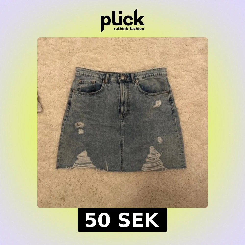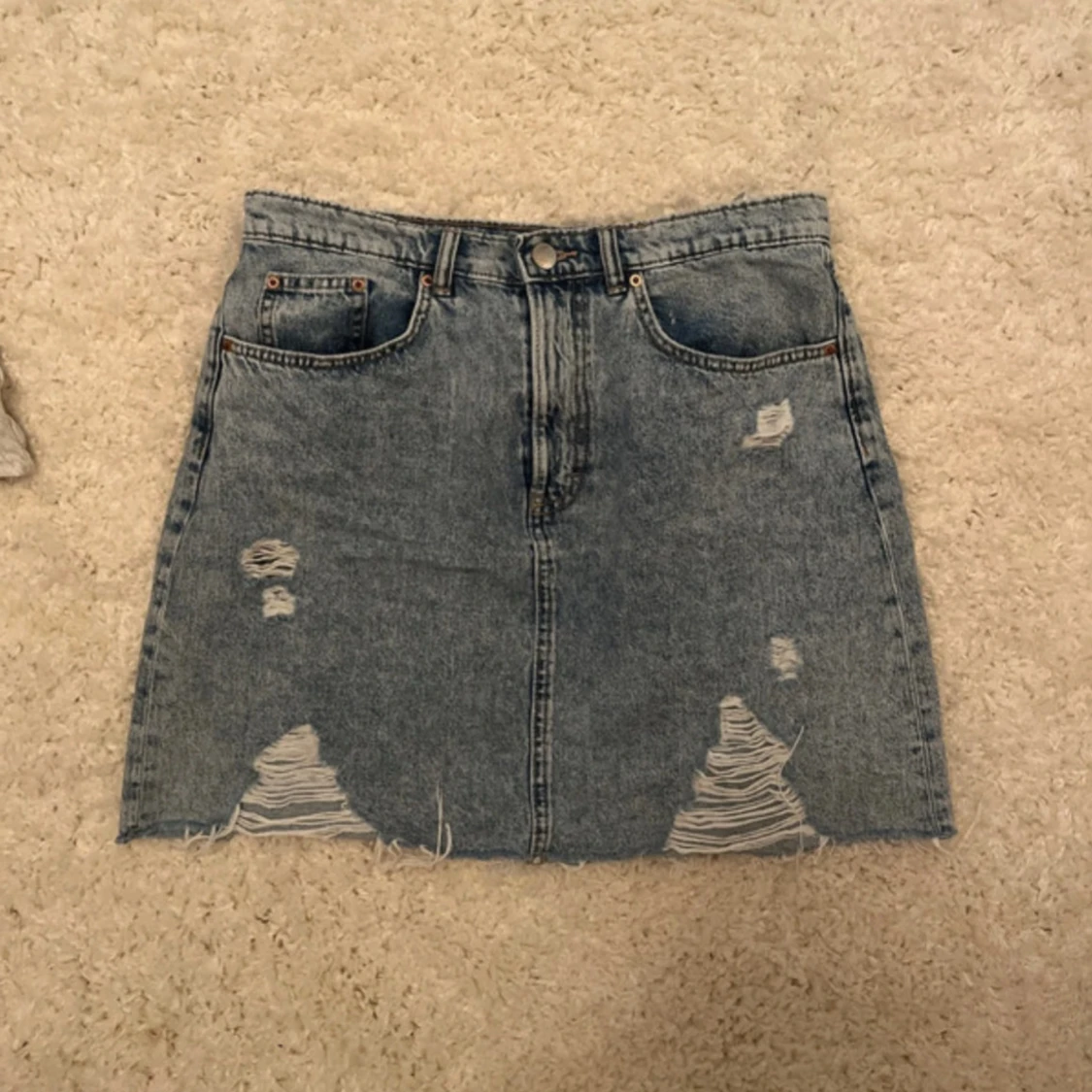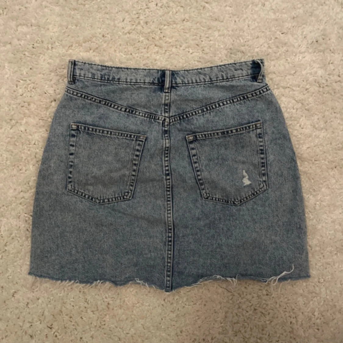 Snygg blå jeanskjol med rå kant och slitna detaljer framtill. Klassisk femficksmodell med dragkedja och knapp i midjan. Perfekt för dig som gillar en avslappnad och trendig stil.