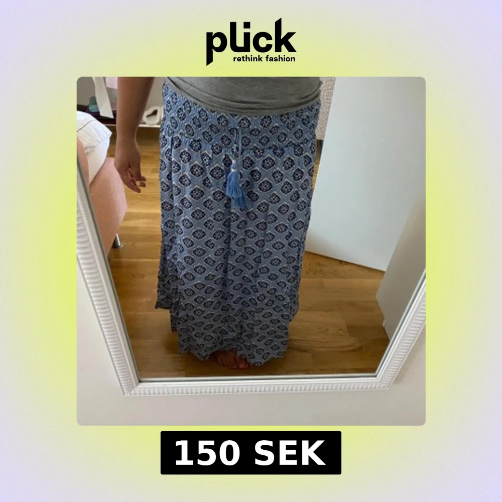 Supersnygg blå långkjol från Gina Tricot med vitt och mörkblått blommönster. Kjolen har smock i midjan och är stretchig! Kjolen är använd och tvättad❣️💛
