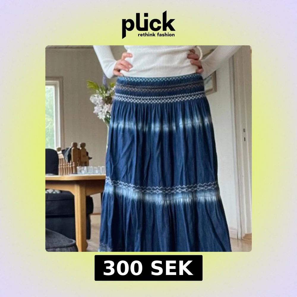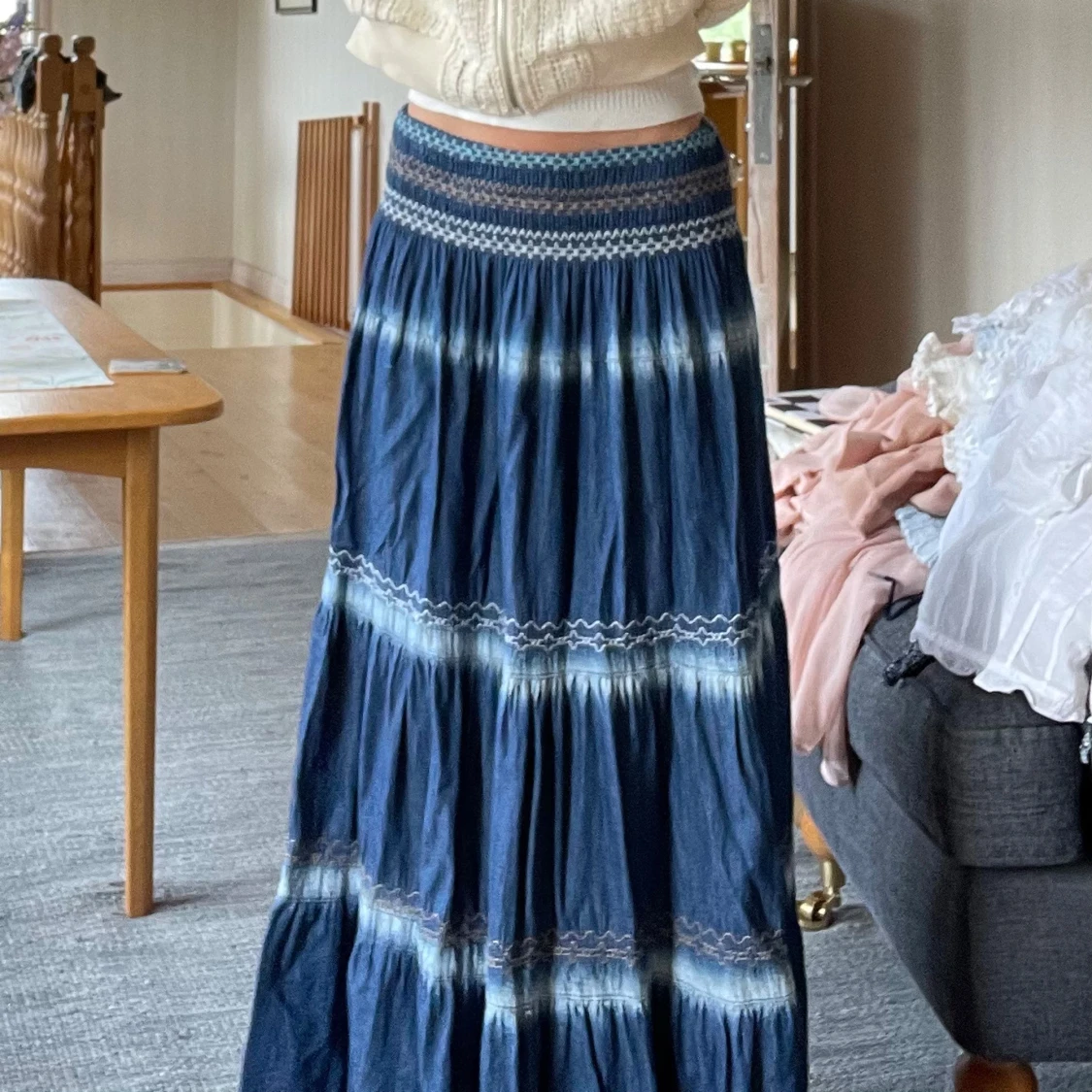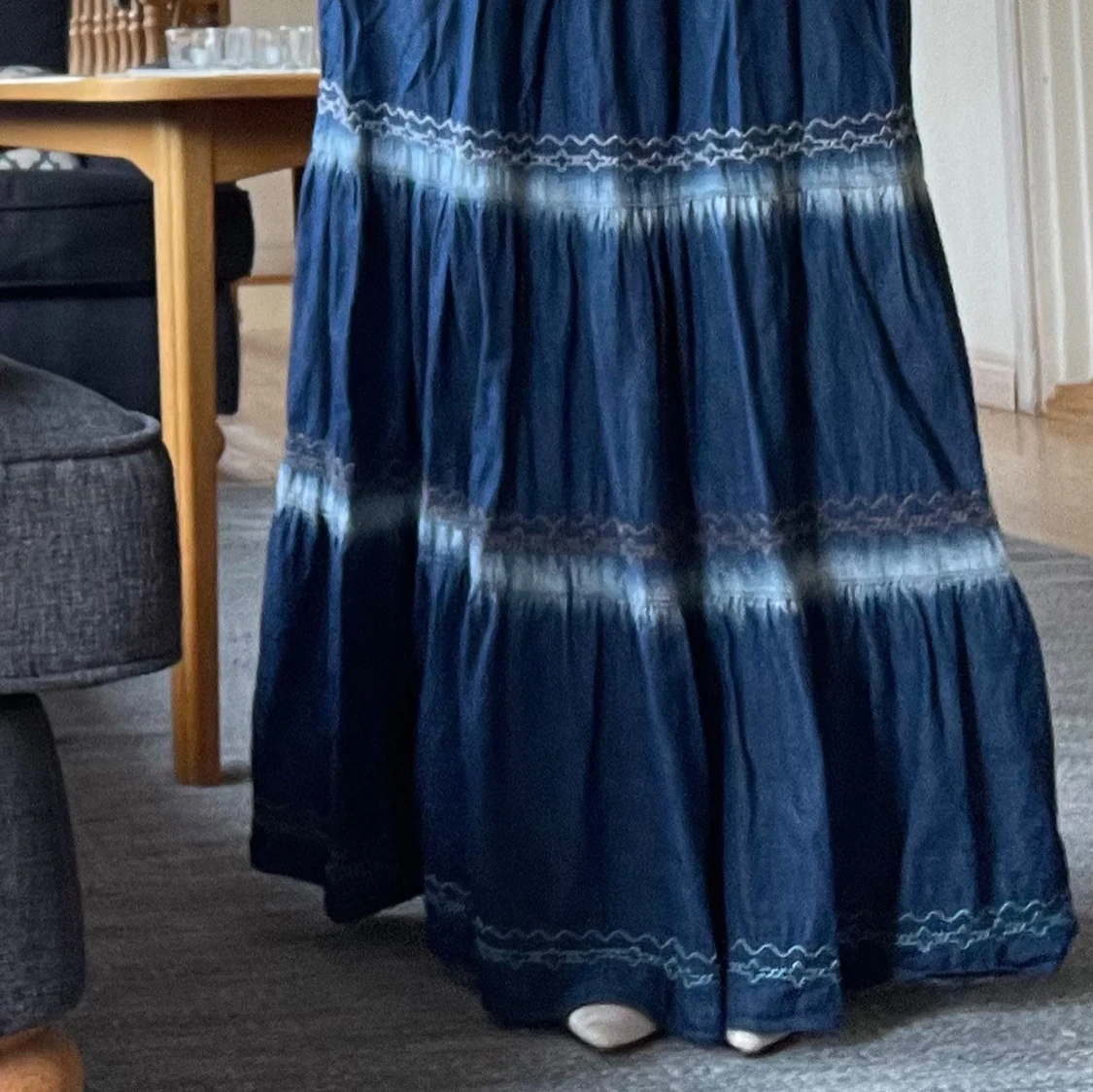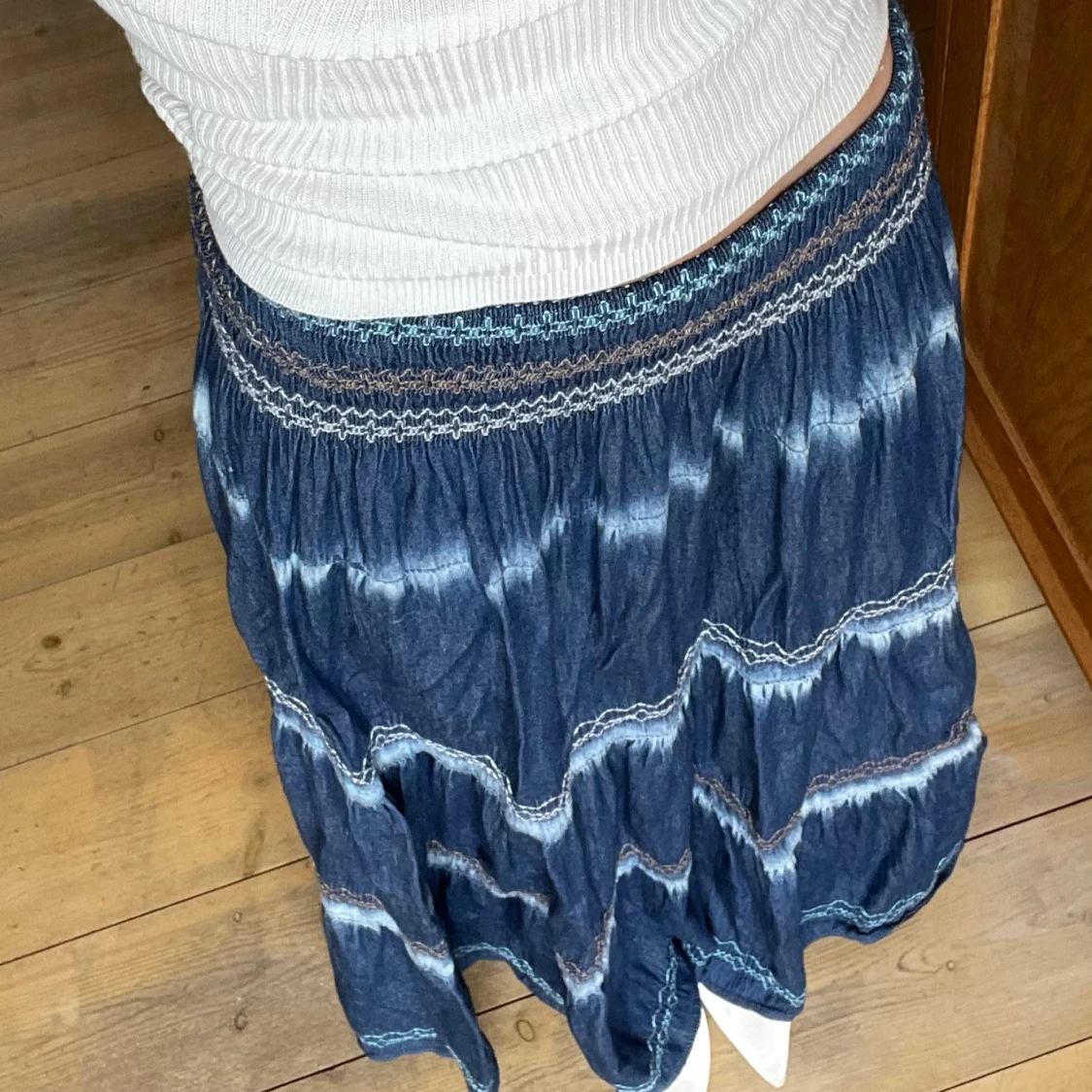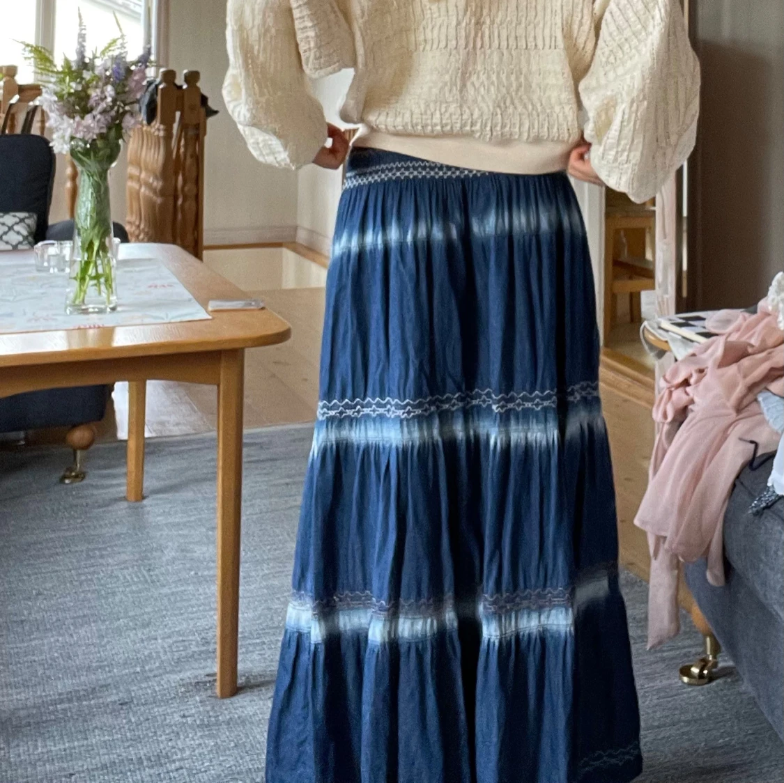 Supersnygg blå långkjol med broderade vågiga detaljer och smock i midjan. Kjolen har flera volanger och ett coolt batikmönster i vitt. Nypris på 600kr😋🫶