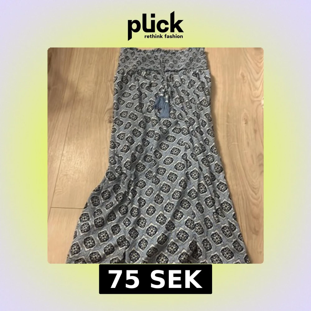 Långkjol i ljusblått med mörkblått och vitt mönster. Smockad upptill och dekorativ snörning med tofsar framtill. Luftigt material, perfekt för varma dagar. Använd fåtal gånger förra sommaren (2024) 💕Minns inte nypris