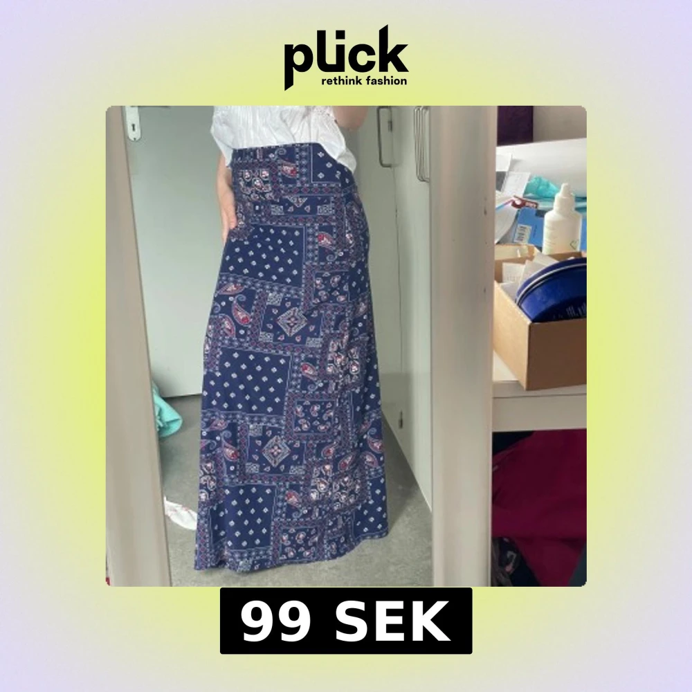 Supersnygg blå långkjol med patchwork-inspirerat paisleymönster i vitt och rött. Kjolen har hög midja och rak passform som faller snyggt längs benen. Perfekt för dig som gillar boho-vibe och vill sticka ut lite extra.