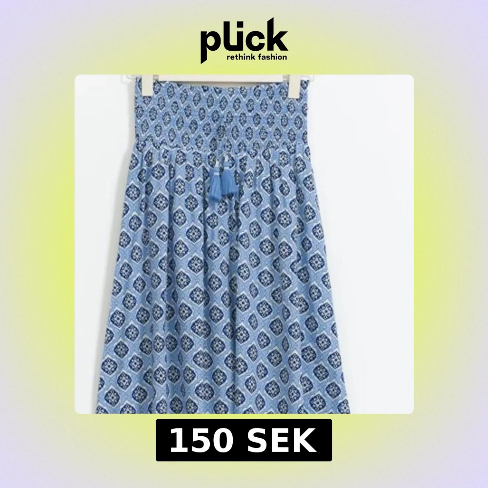 Säljer en blå långkjol med vitt och mörkblått grafiskt mönster. Kjolen har smock i midjan och dekorativa tofsar framtill. Perfekt för dig som gillar bohemisk stil och vill ha något luftigt och snyggt.