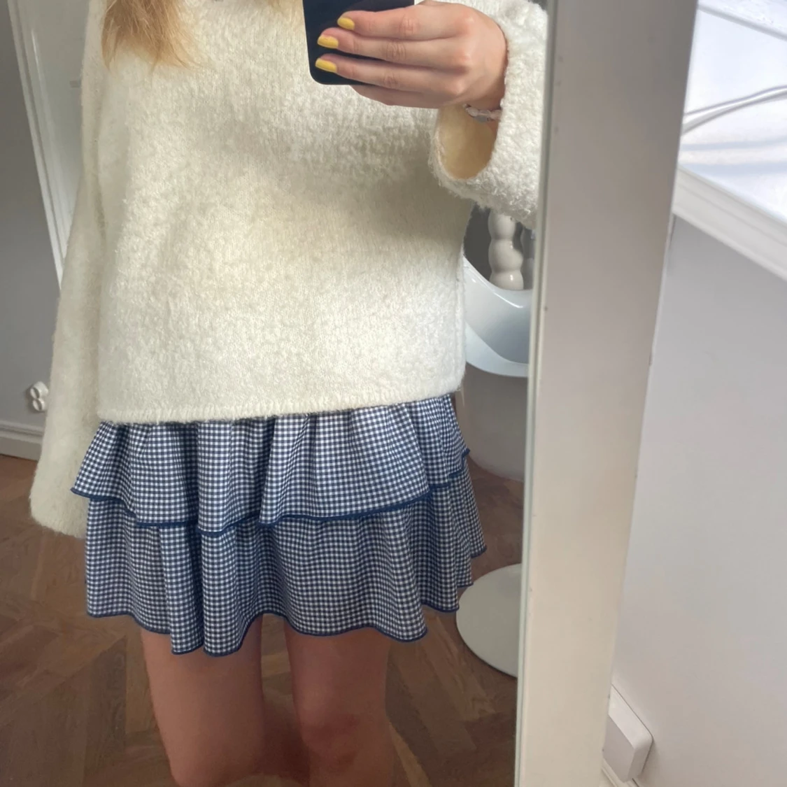 Säljer en superfin blå och vit rutig kjol från Zara. Kjolen har en volangdetalj som gör den extra söt och perfekt för både vardag och fest. Den är i storlek M och passar perfekt till en stickad tröja eller en enkel topp. Perfekt för vår och sommar!passar mig som brukar ha xs!