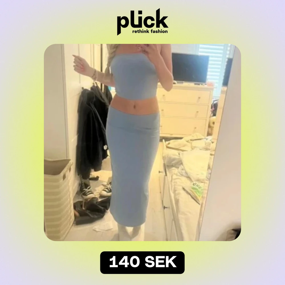 Säljer mitt jättefina ljusblåa set, kjolen är menad att ha lågmidjad, men det går super bra att ha högmidjad också. Säljer då settet är för litet för mig.🩵 Skriv privat för mer info och bilder.