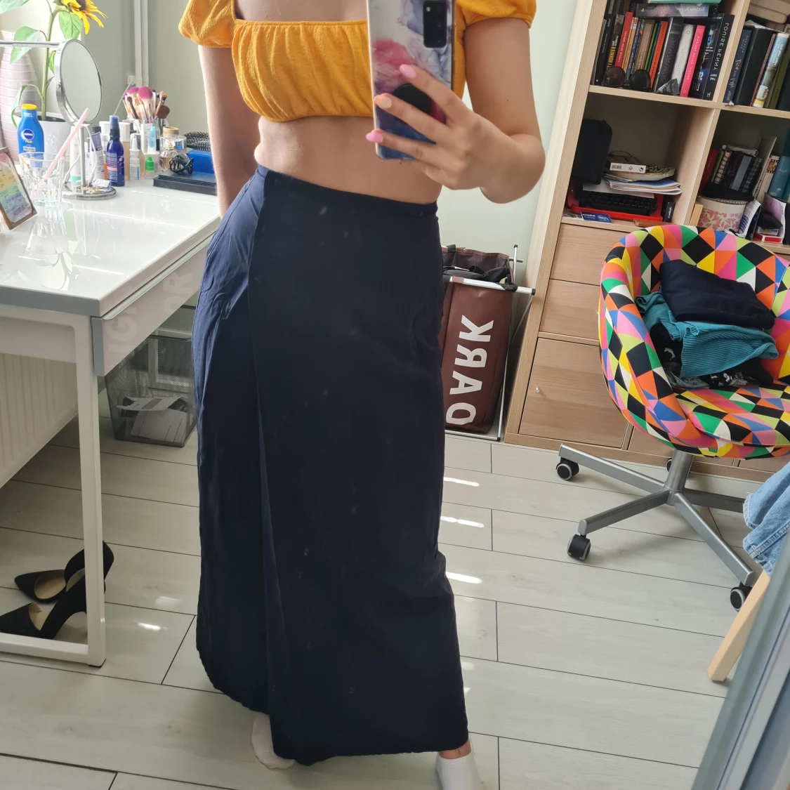 Jättefin kjol med knappar upptill. För referens är jag 165 lång och tycker den är perfekt längd på mig. Snygg detalj med veck (ingen slits). Sparsamt använd.
