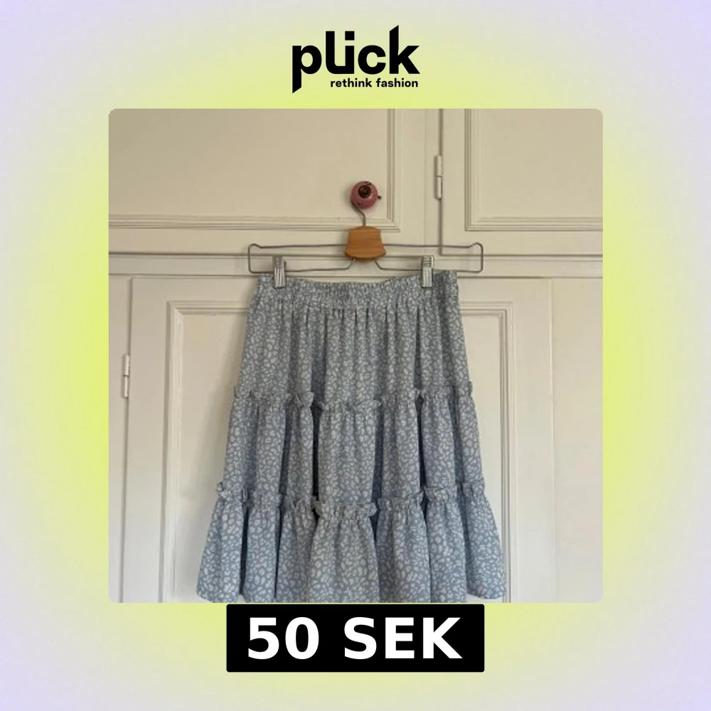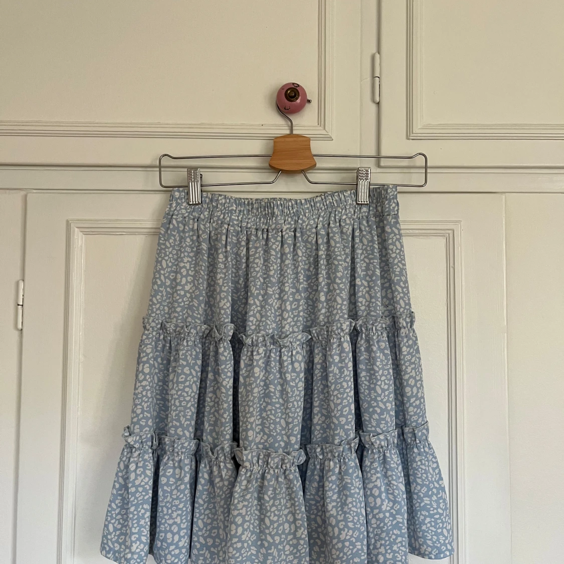 Supersöt blå kjol med volanger och vitt leopardmönster. Resår i midjan och luftig med flera lager som ger volym. Aldrig använd🤍