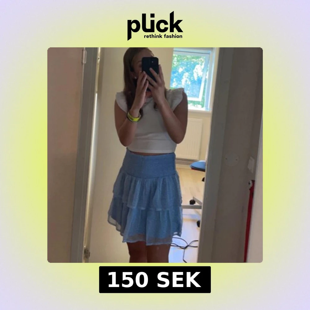 Supersöt ljusblå kortkjol med volanger och bred resår i midjan. Kjolen är högmidjad men går att vika ner om man vill. Kjolen har en liten defekt vid resåret som syns på bild 4. Säljer då den inte kommer till användning och är lite förstor för mig.