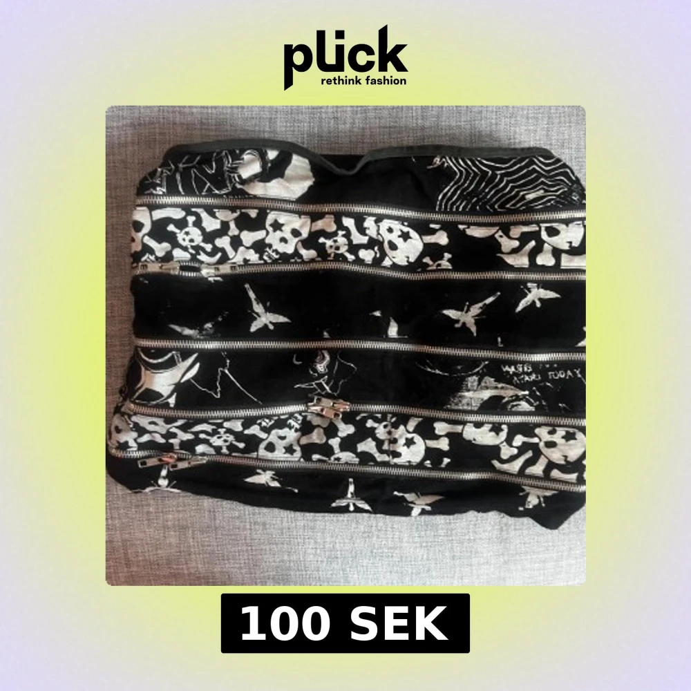 Cool svart kortkjol med vita dödskallar och benknotor som mönster. Kjolen har flera silvriga dragkedjor som detaljer och ger en edgy vibe. Perfekt för dig som gillar alternativ stil och vill sticka ut.