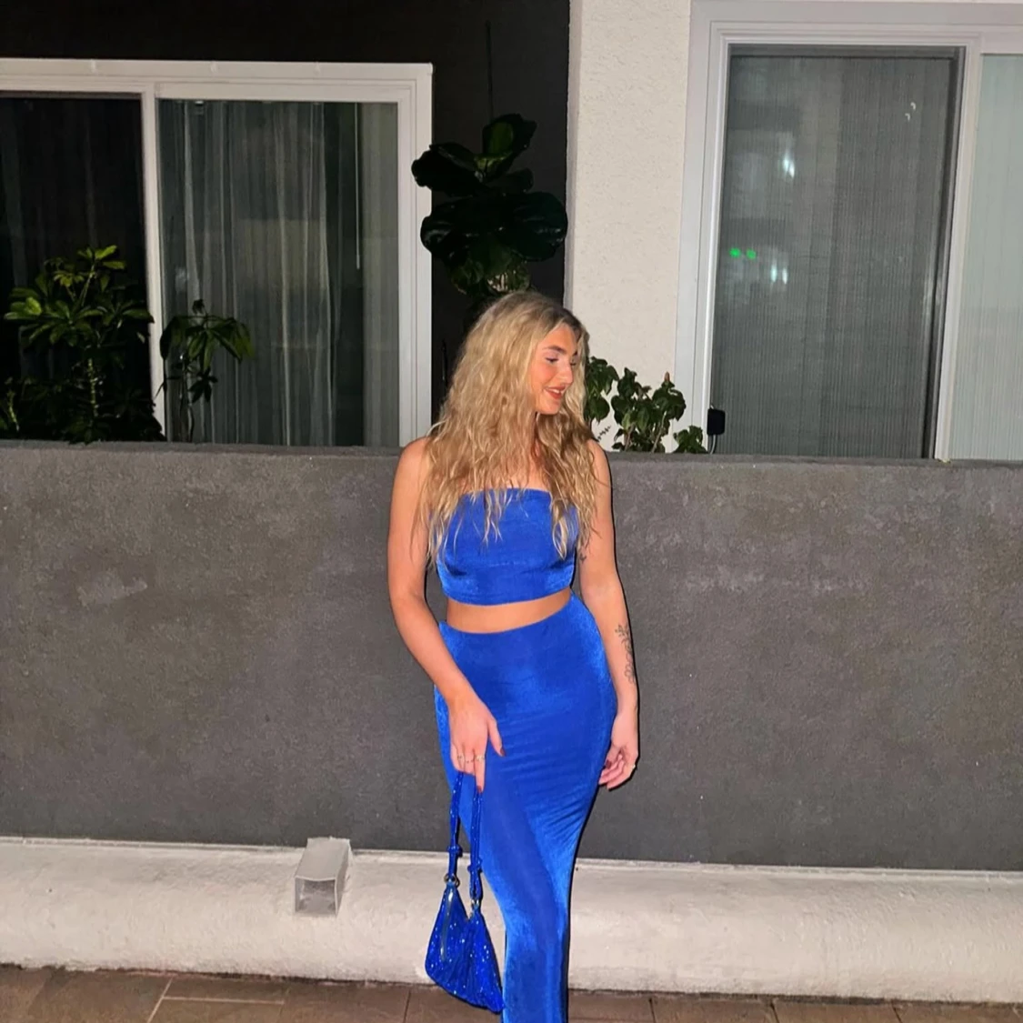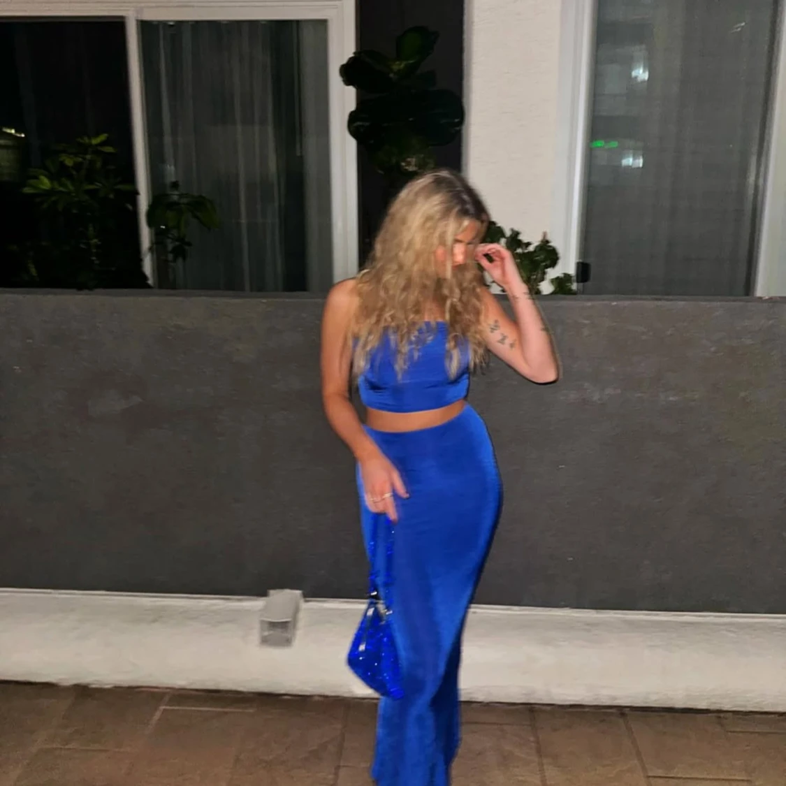 Säljer ett snyggt blått bandeau topp set som är croppad och sitter tight men har även mycket stretch. Setet har en enkel, stilren design och är gjord i ett mjukt, stretchigt material som känns skönt mot huden.