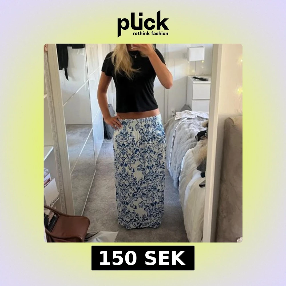 Supersnygg långkjol i vitt med blått blommönster och bred resår i midjan. Kjolen har en luftig och flowy passform som känns perfekt för varma dagar. Den är lätt att matcha med en enkel topp och sneakers för en chill look.