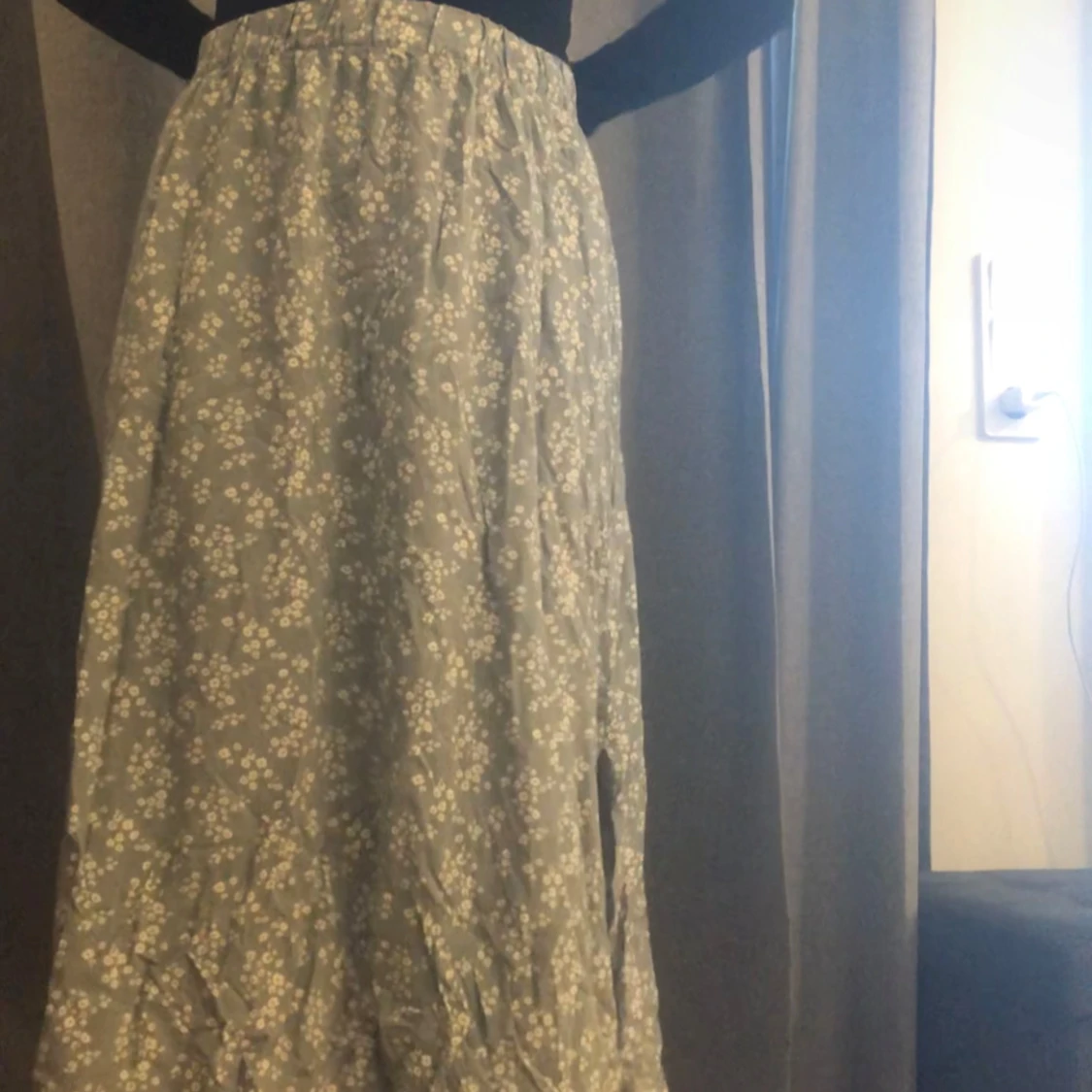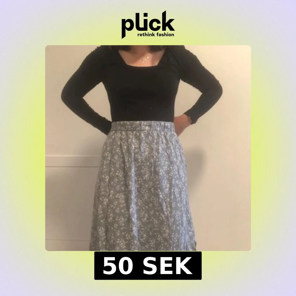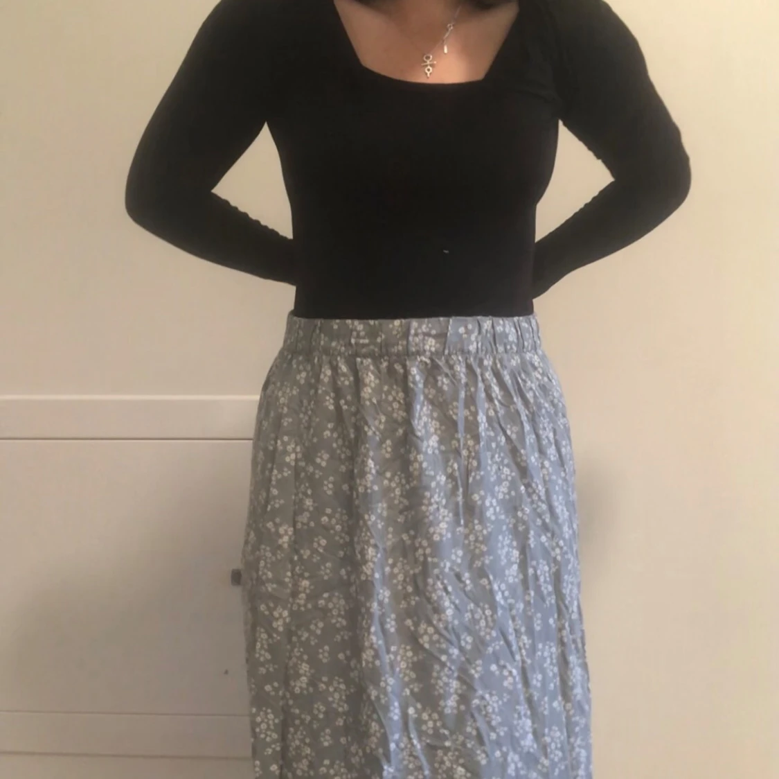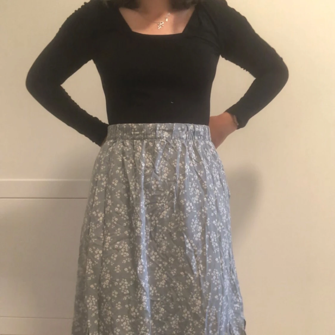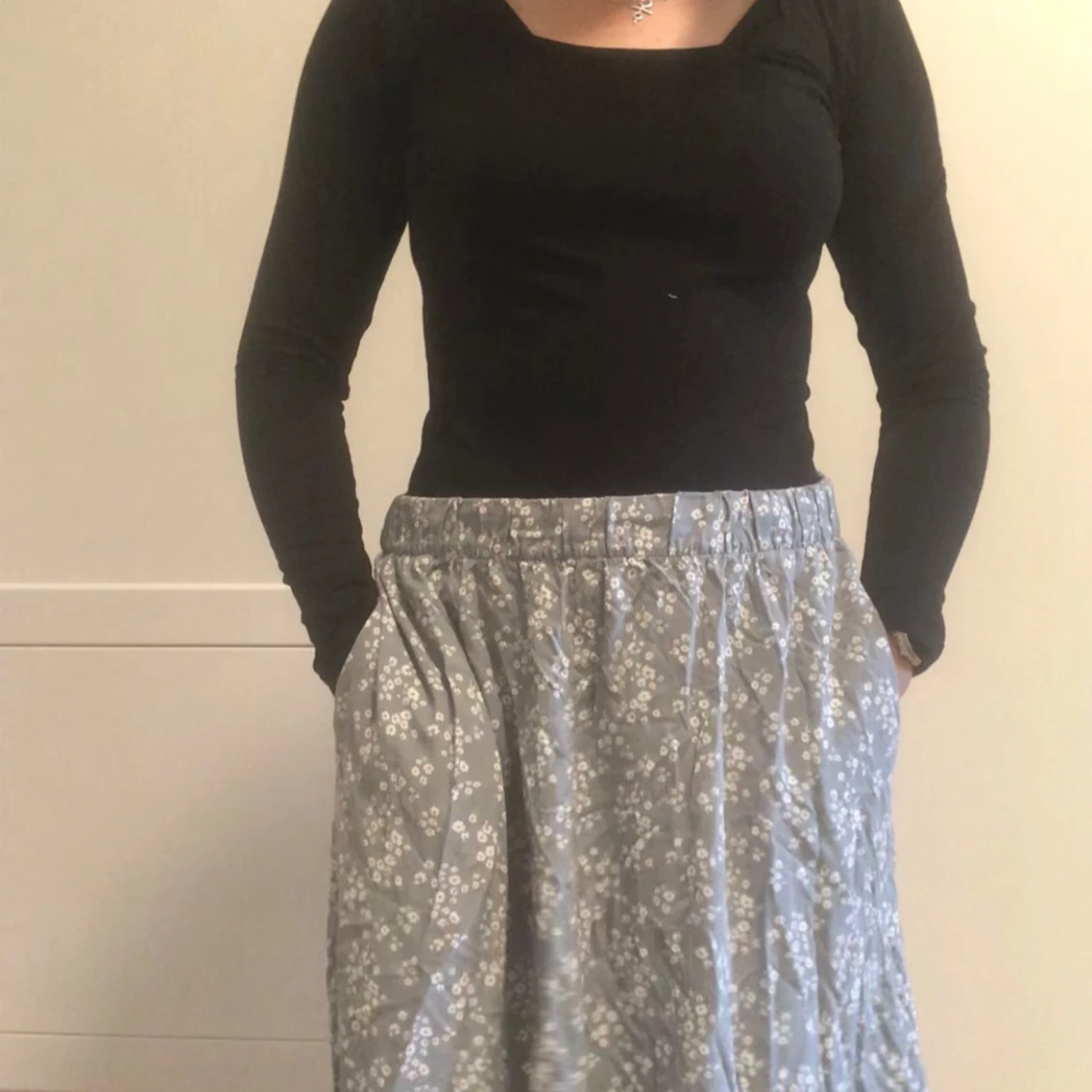 Supersöt blå långkjol med vitt blommigt mönster och praktiska fickor. Kjolen har en hög midja med resår och är lätt och flowy, perfekt för att ge en chill och feminin vibe. Passar dig som gillar romantiska detaljer och vill ha något som sticker ut. Storlek L
