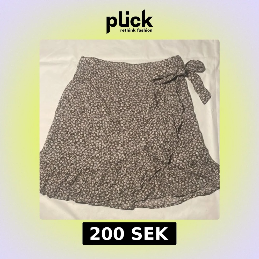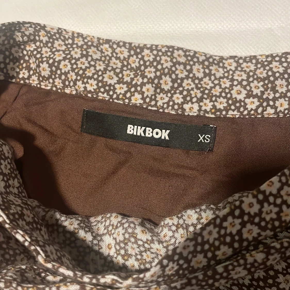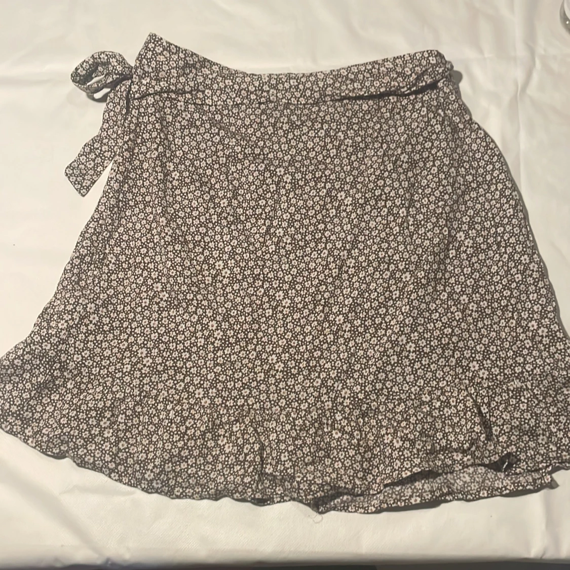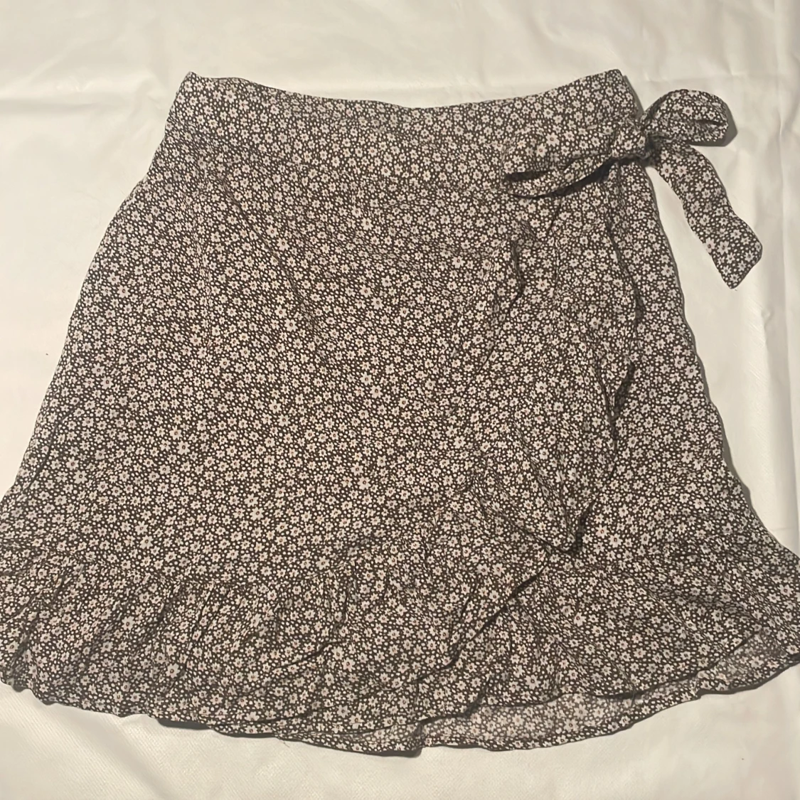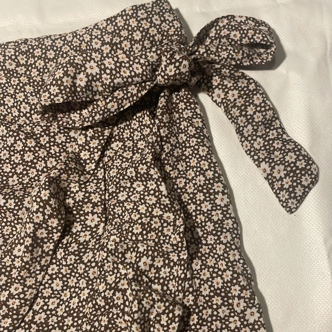 Brun kort omlottkjol från BikBok i blommigt mönster. Kjolen har volangkant nertill och knyts i sidan med en rosett.