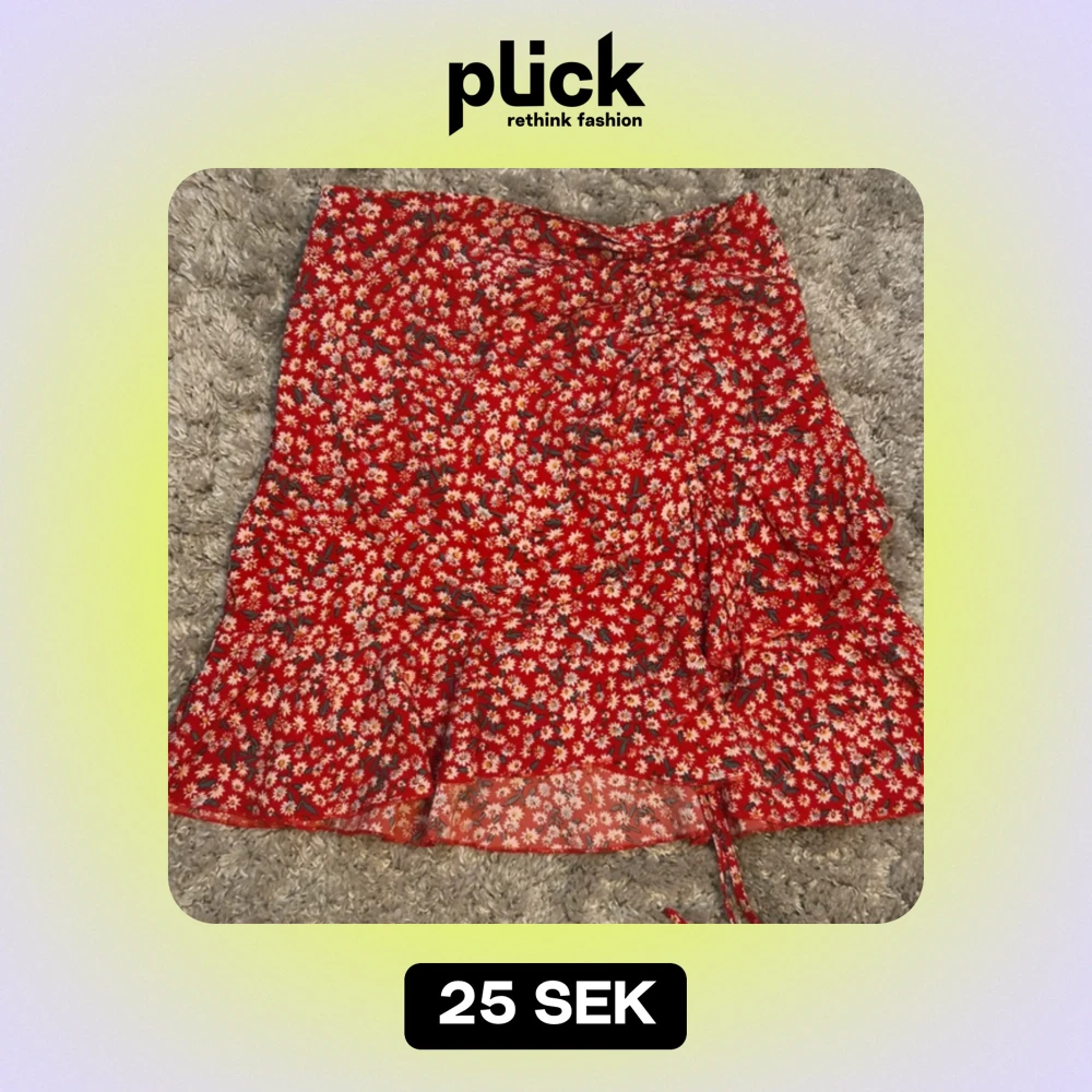 Säljer en superfin röd kjol med blommigt mönster. Den har en söt volangdetalj och Kjolen är i omlottstil och har en knytning på sidan