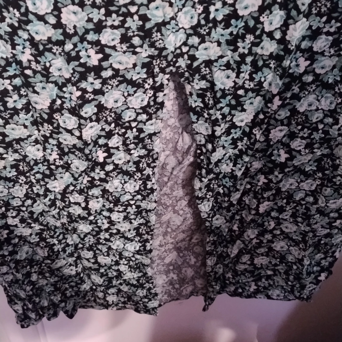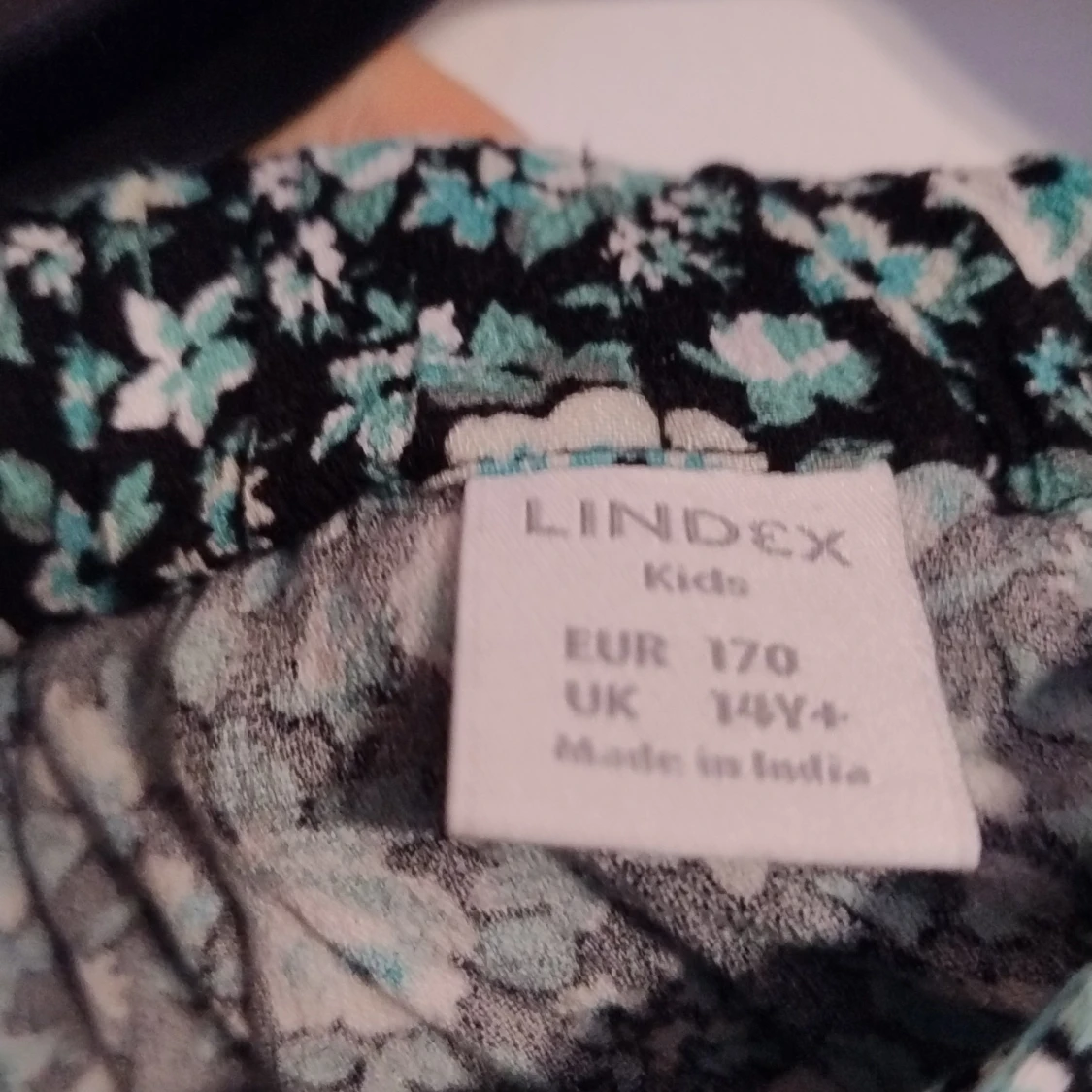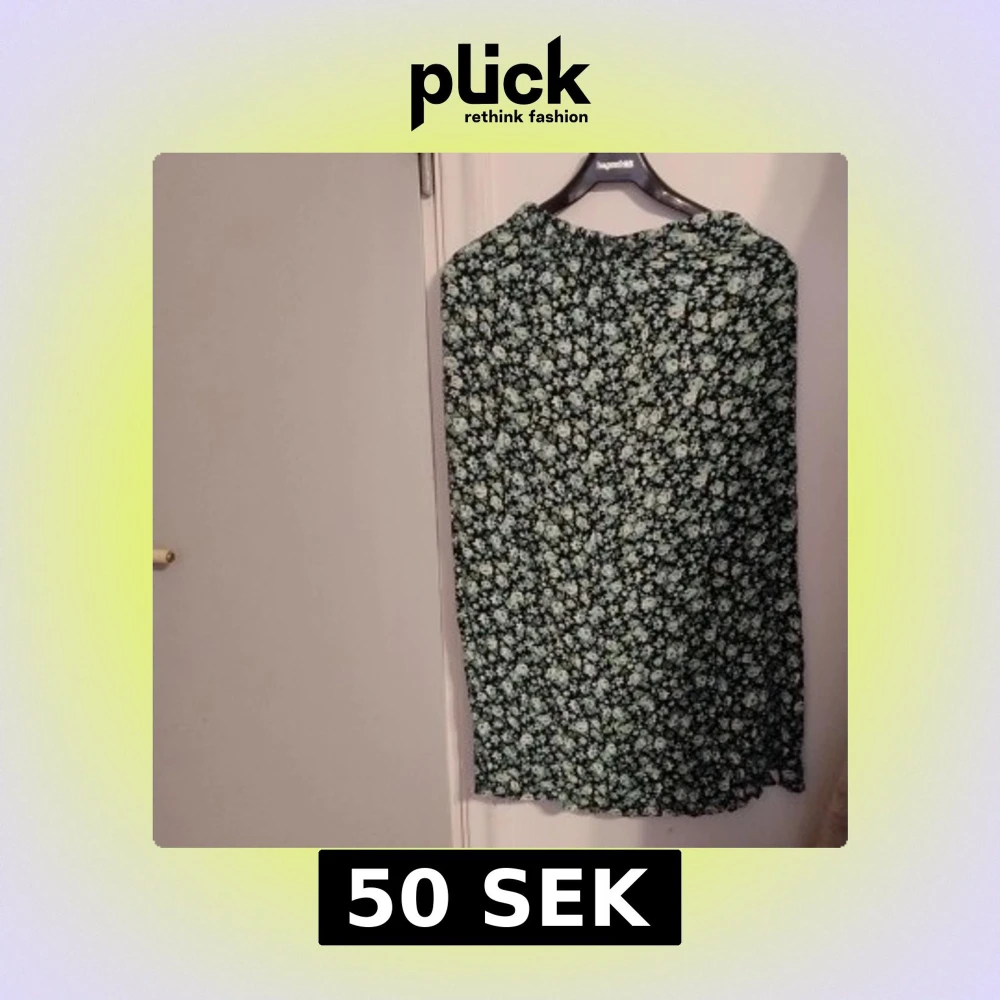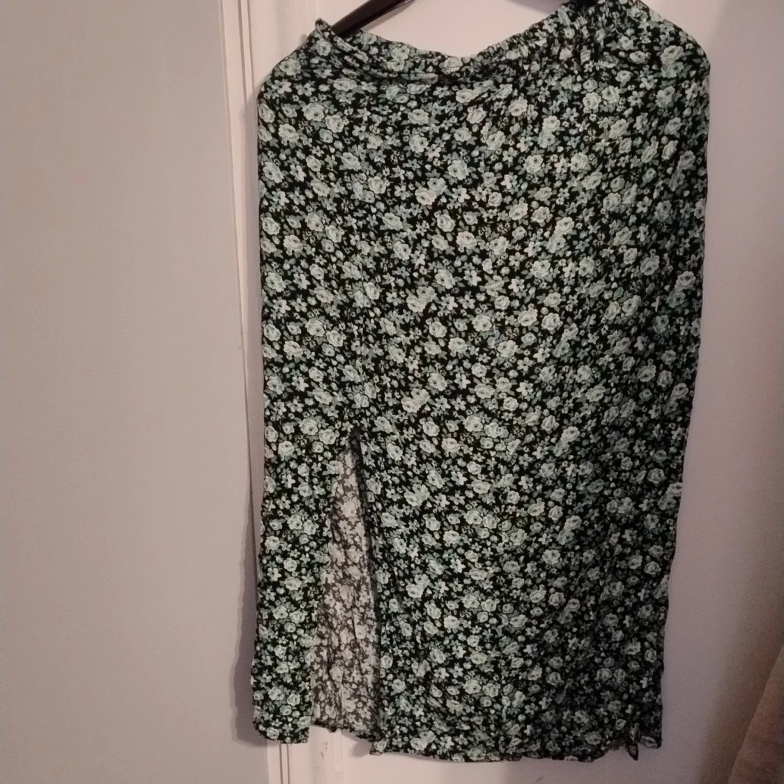 Säljer en fin blommig kjol från Lindex i storlek 170. Kjolen har en svart bas med ett vackert blommönster i grönt och vitt. Den har en slits framtill som ger en extra detalj till designen.