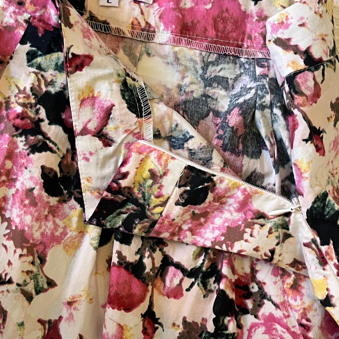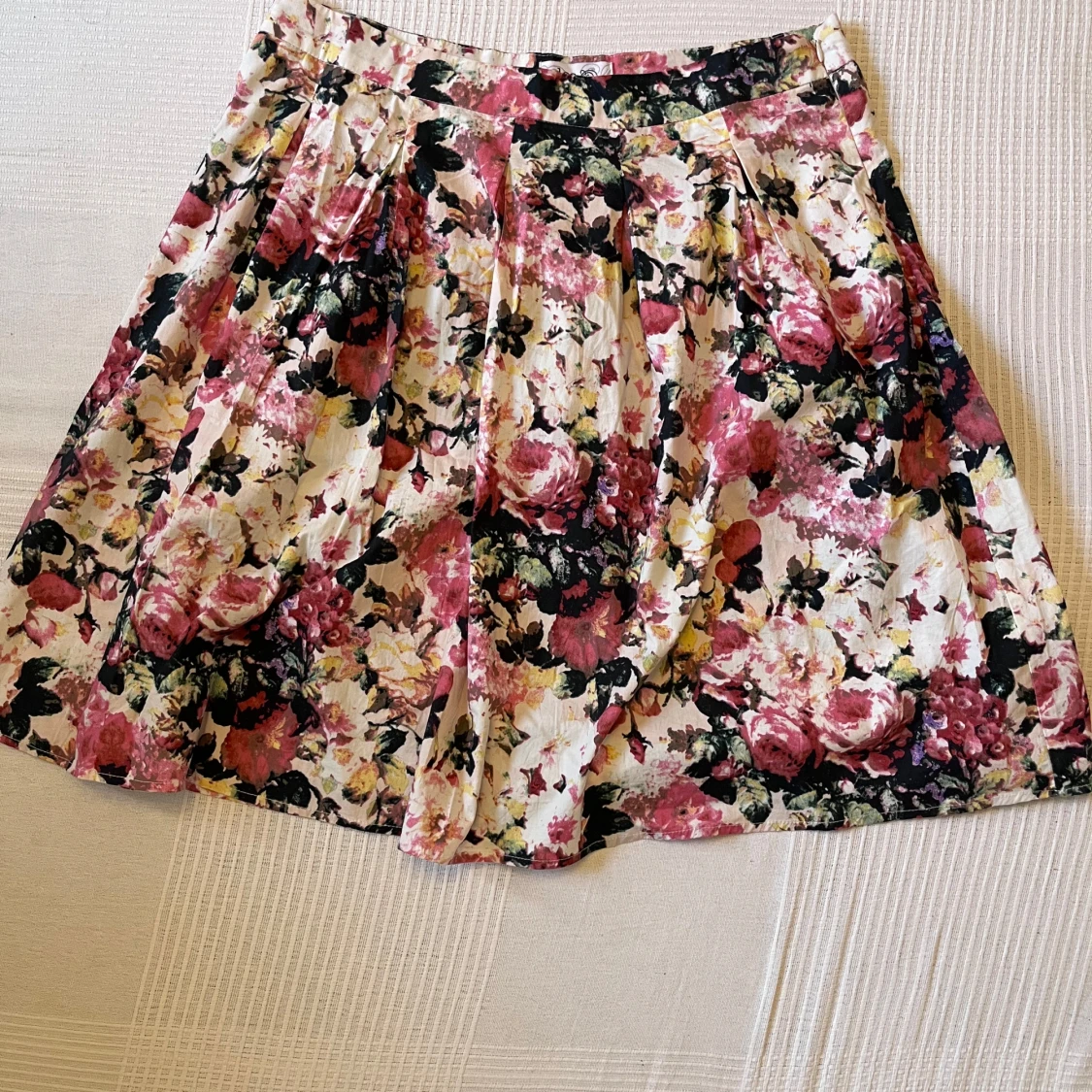 Supersnygg kortkjol från Holly & Whyte by Lindex med blommigt mönster i rosa, svart, beige och grönt. Kjolen har en lätt utställd form och dragkedja i sidan. Perfekt för dig som vill sticka ut med färg och mönster.