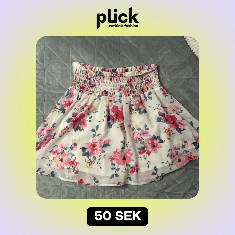 Superfin blommig kortkjol med resårmidja som ger en bekväm passform.