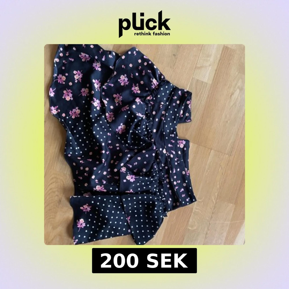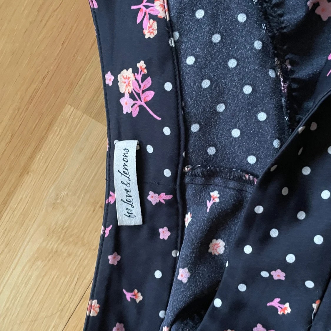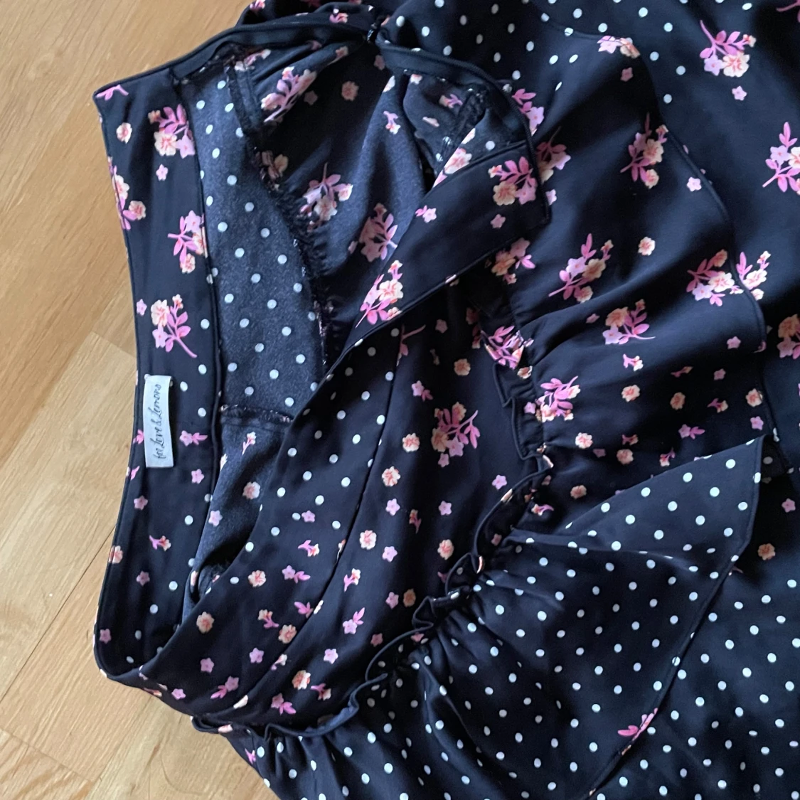 Snygg kjol med en mix av blommigt och prickigt mönster i rosa och vitt på en mörkblå bakgrund. Kjolen har volangdetaljer och en omlott-design som ger en feminin touch. Perfekt för att sticka ut med en unik stil.