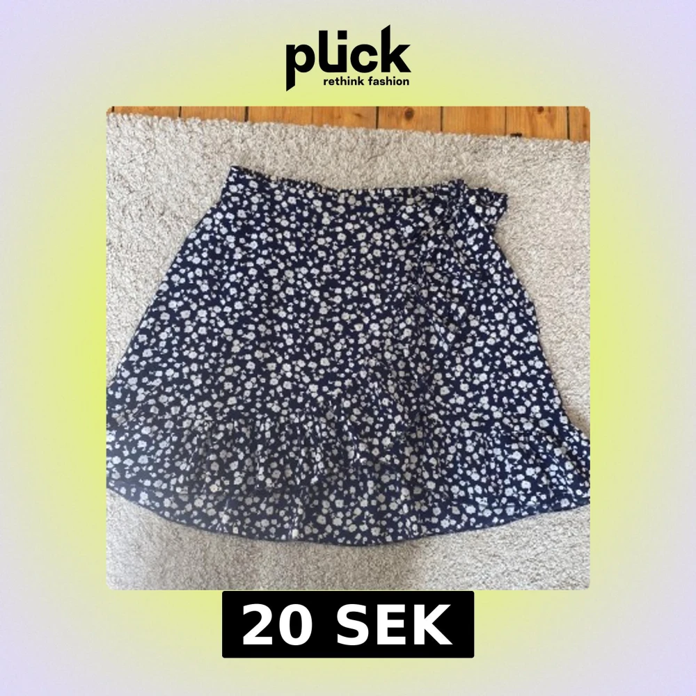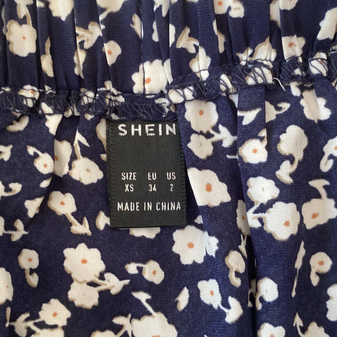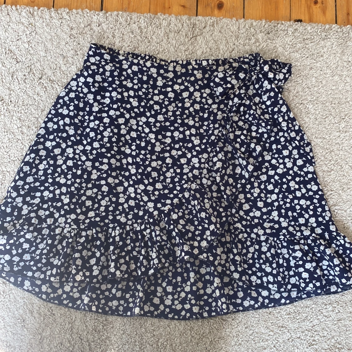 Supersöt omlottkjol från Shein i marinblått med vitt blommönster. Kjolen har volang längs nederkanten och knyt i sidan för extra detalj.
