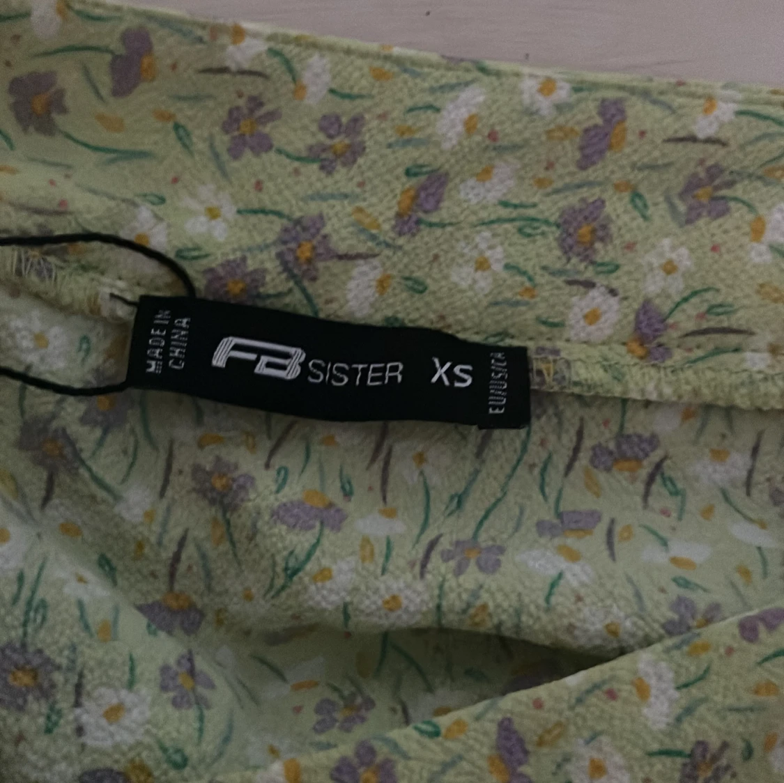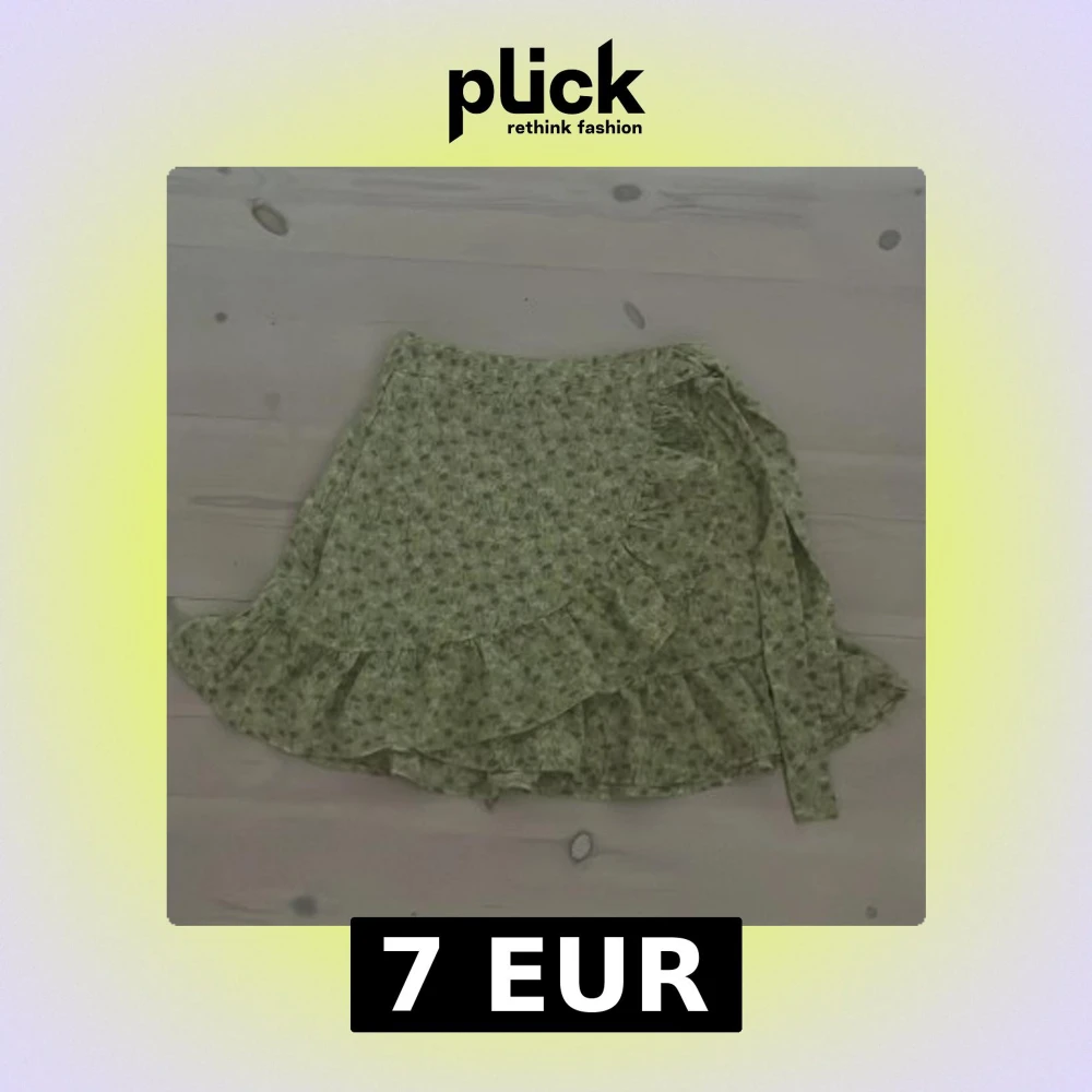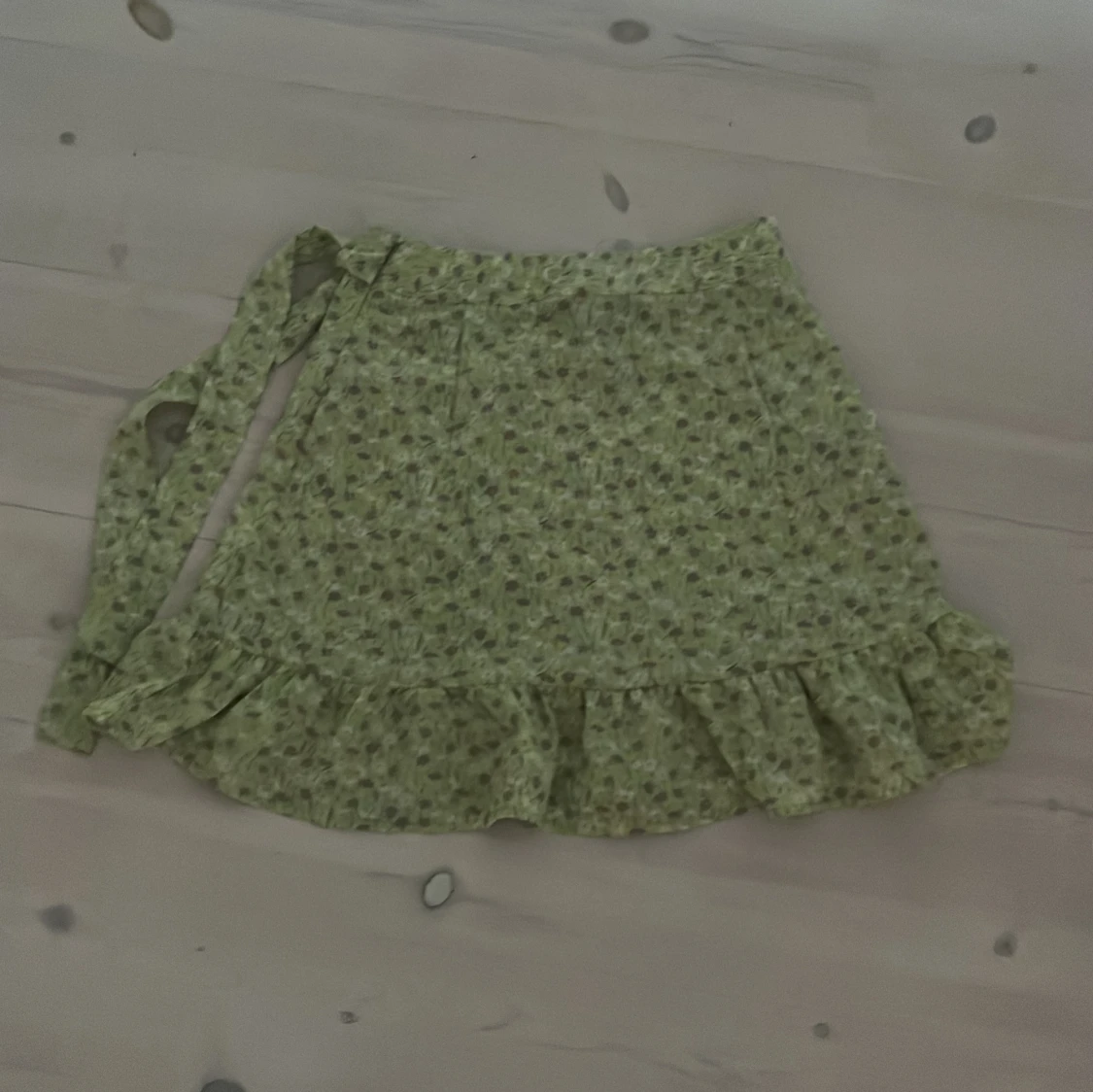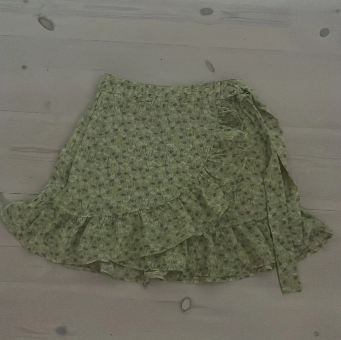 Supersöt kort omlottkjol från New yorker i storlek XS. Kjolen är ljusgrön med blommigt mönster i lila, vitt och gult. Volangkant längs nederdelen och knytband i sidan ger en extra feminin touch. Perfekt för dig som gillar färggranna kjolar.