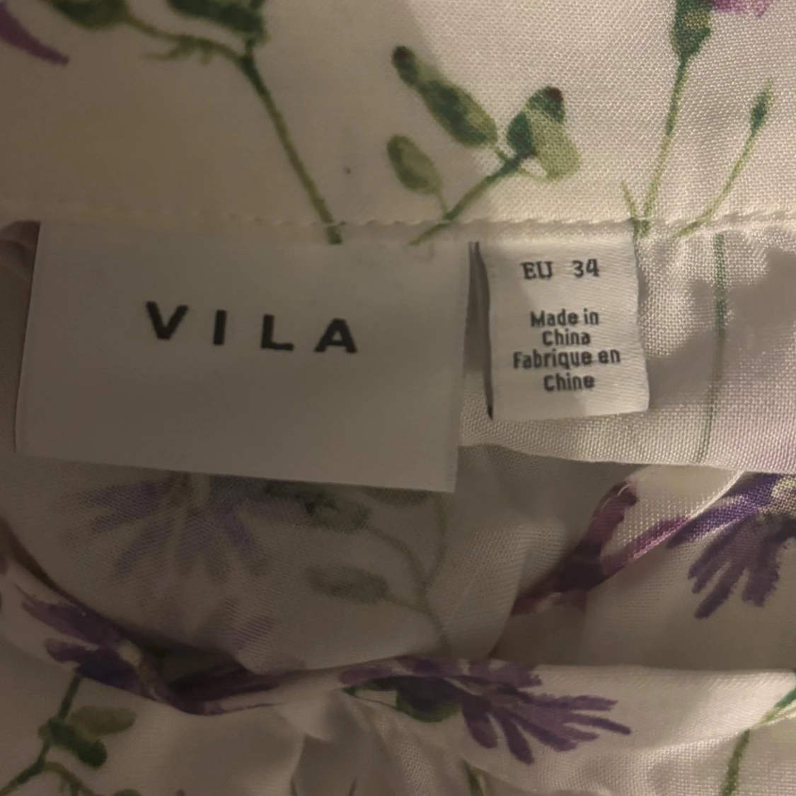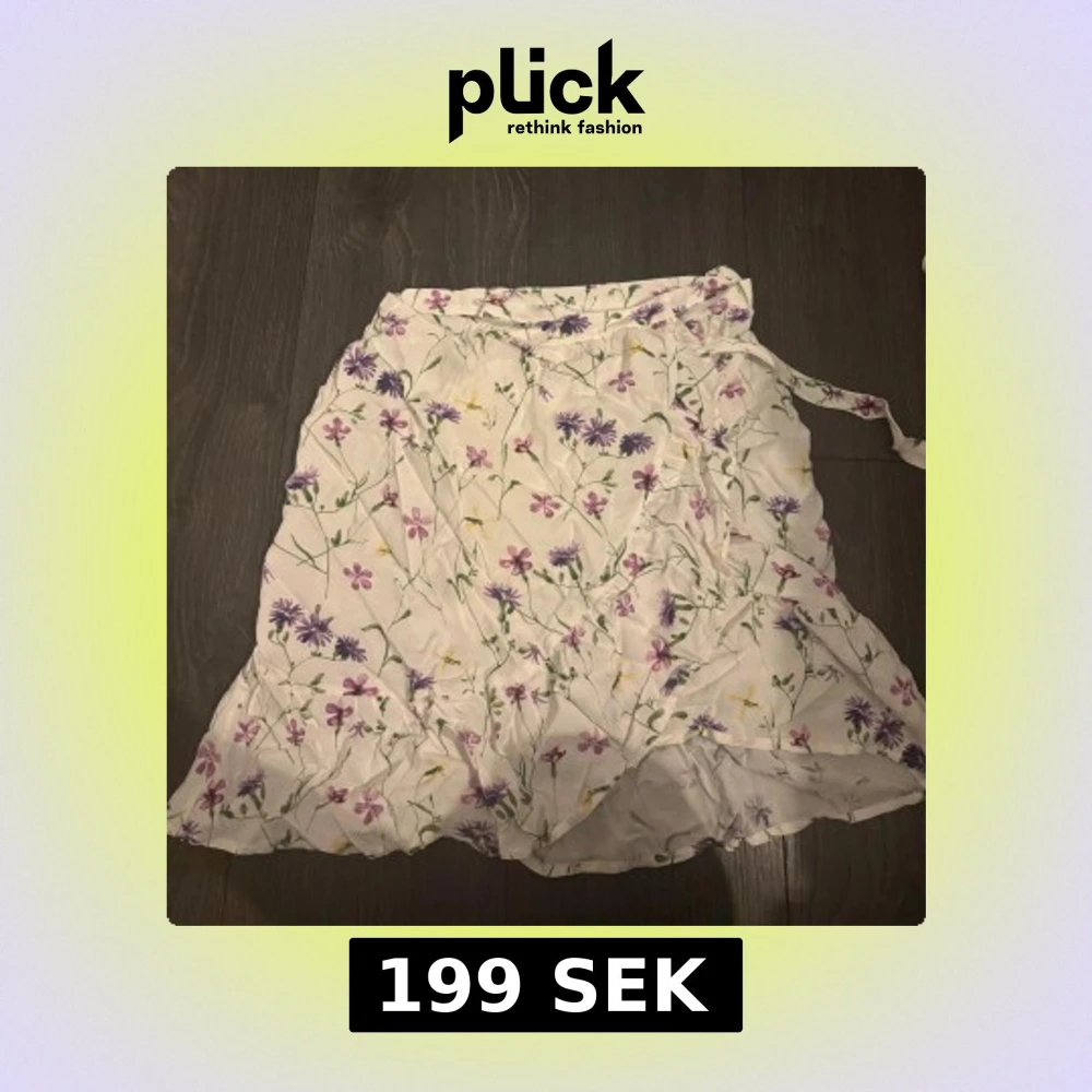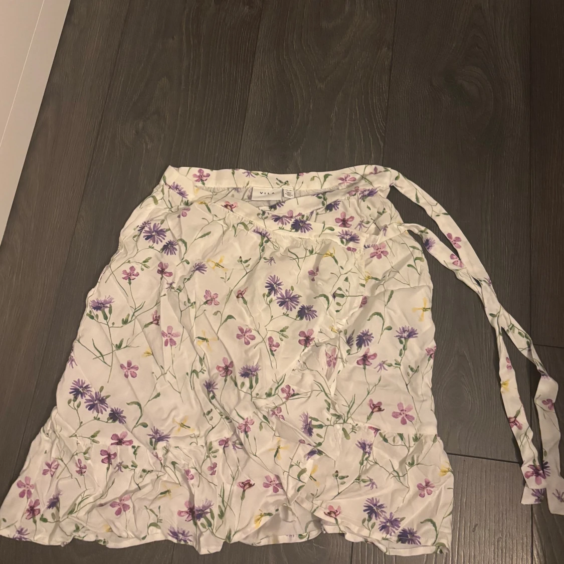 Supersöt kort omlottkjol från Vila i vitt med blommigt mönster i lila, grönt och gult. Kjolen har volangkant och knytband i midjan. Aldrig använd🌸