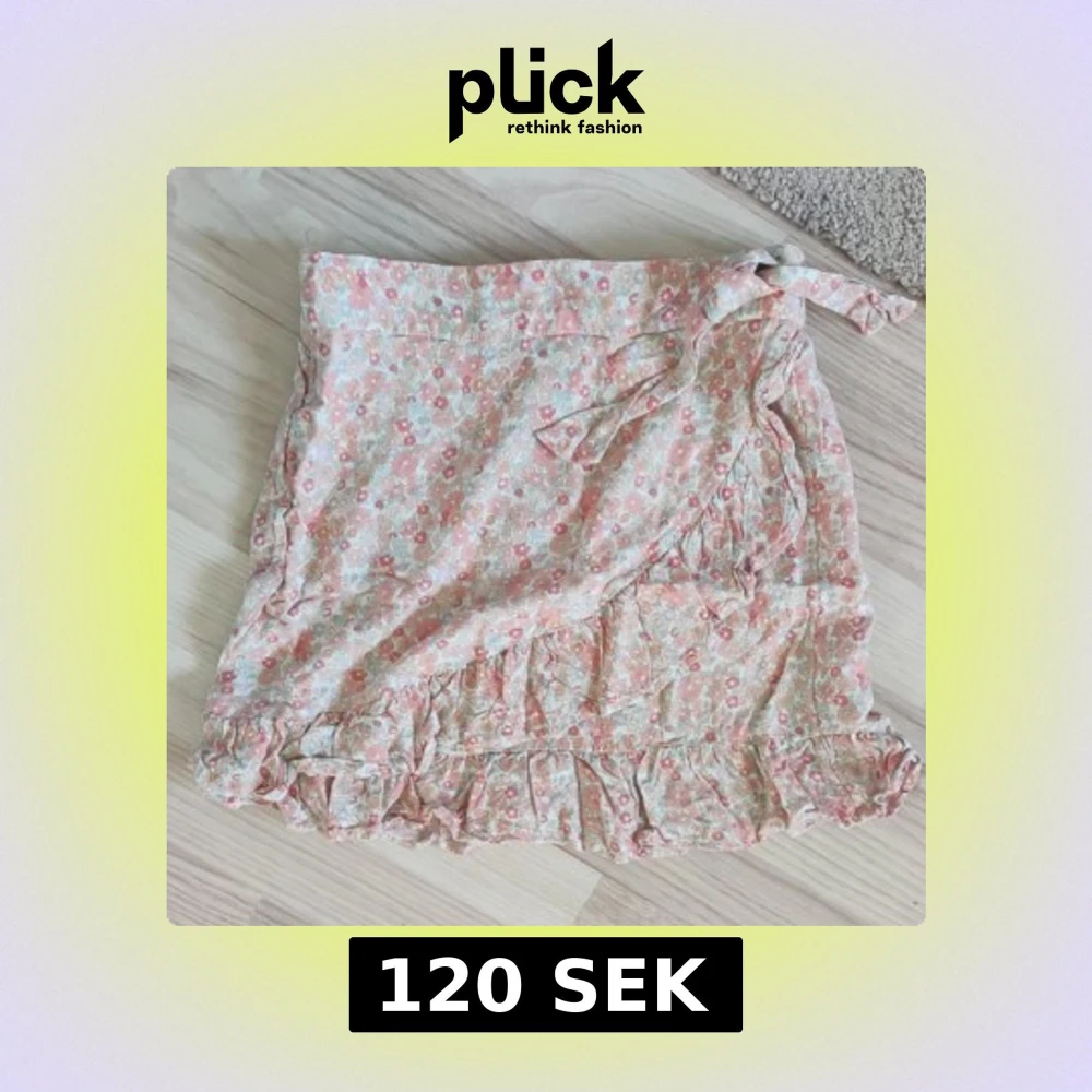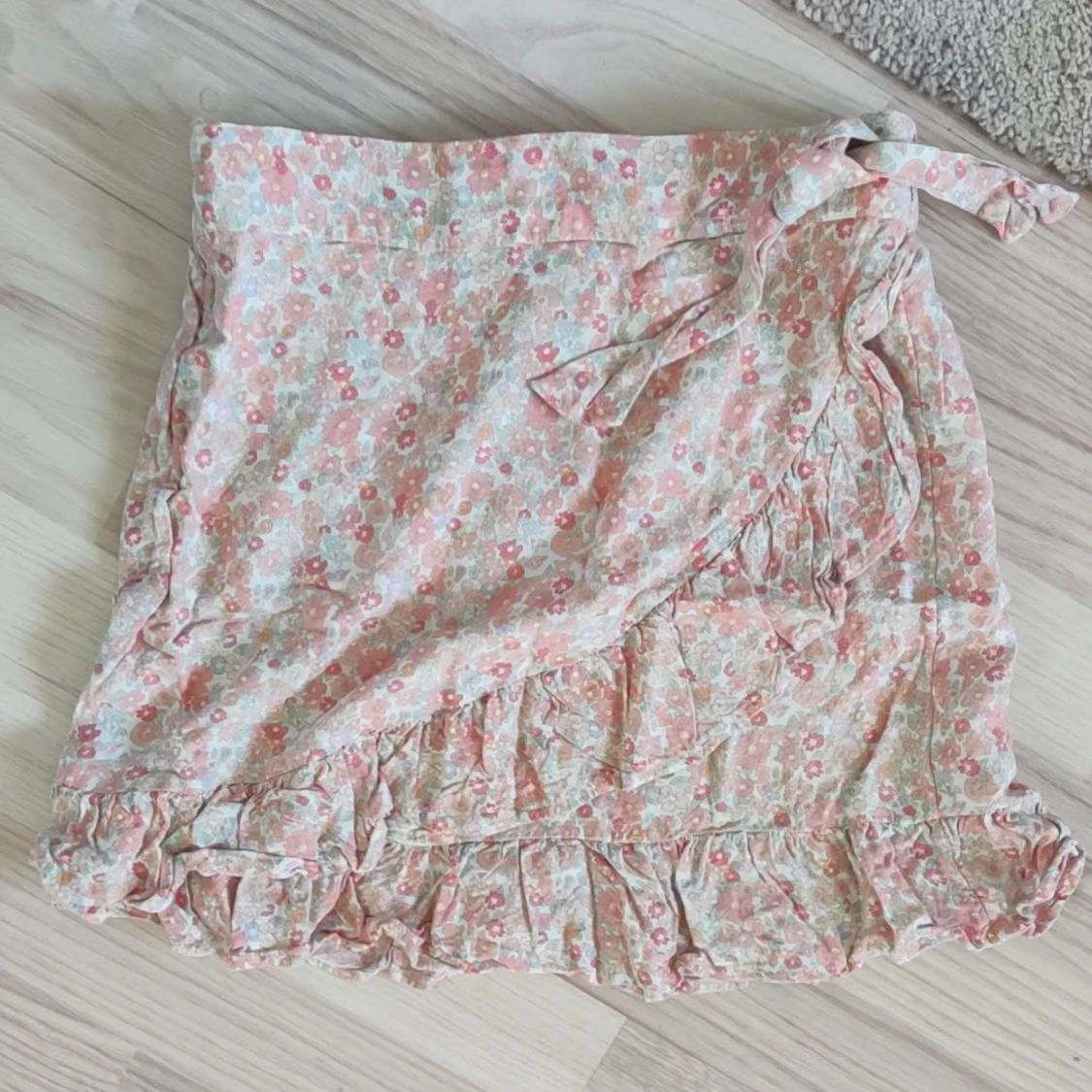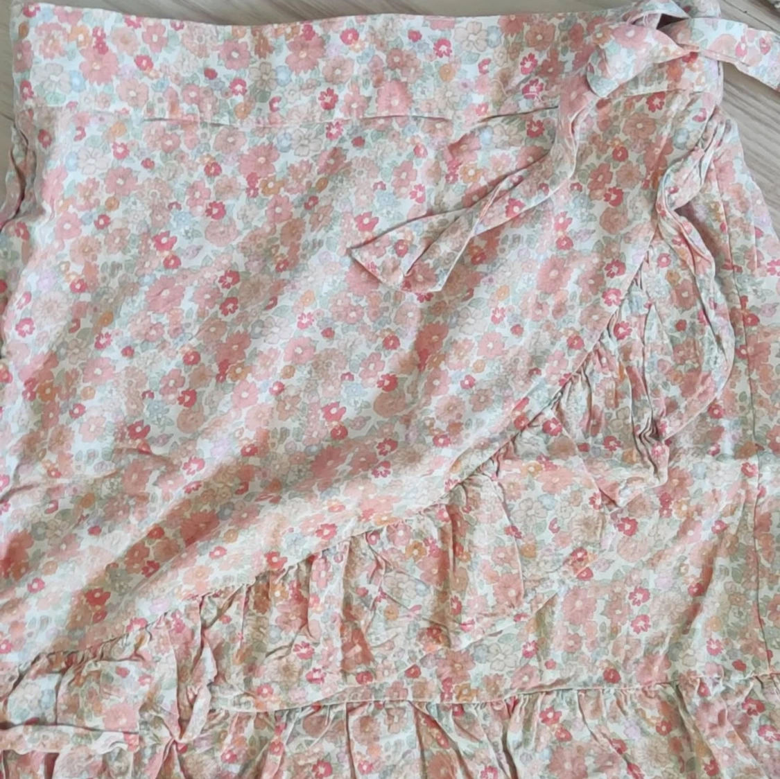 Charmig blommig omlottkjol i ljusa färger med volangdetaljer. Kjolen har ett knytband i midjan och ett lekfullt mönster i rosa och beige toner. Perfekt för en somrig look! 💛