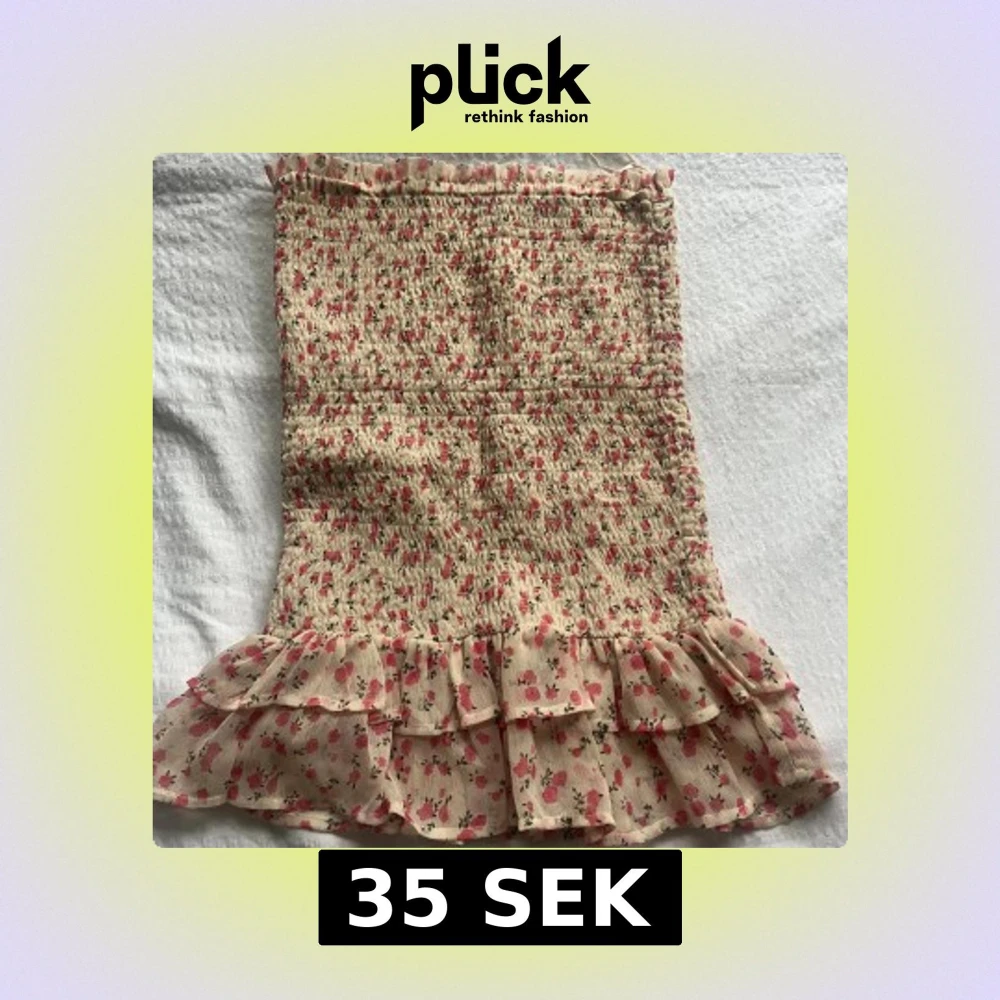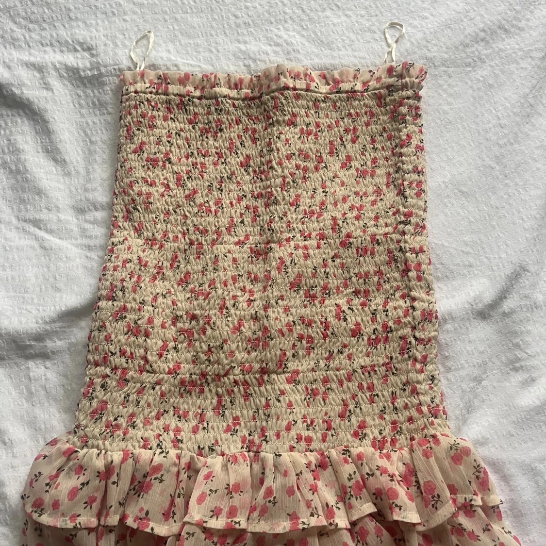 Supersöt kort kjol från Bik Bok i ljusbeige med rosa blommor. Kjolen har smock över hela och dubbla volanger längst ner. Perfekt vardags som fest. Använd någon enstaka gång, inga tecken på användning
