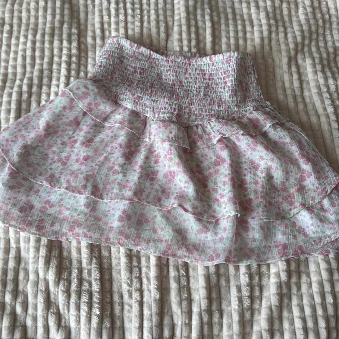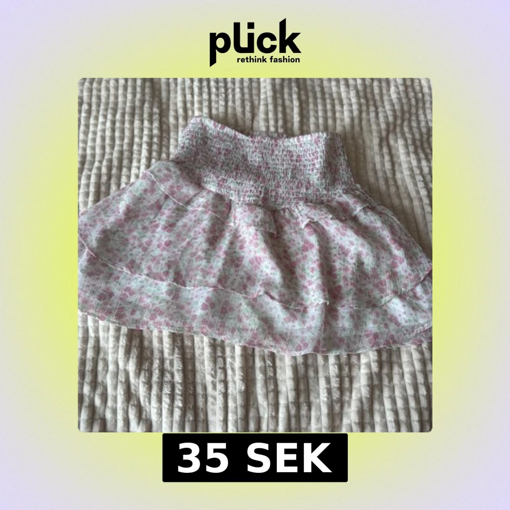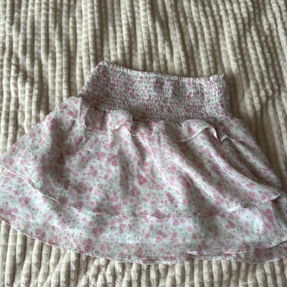 Supersöt kort kjol från Gina Tricot med blommigt mönster i rosa, grönt och vitt. Kjolen har bred smock i midjan och dubbla volanger för extra flow. Perfekt för dig som gillar romantisk och feminin stil.