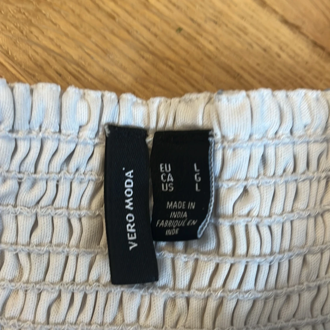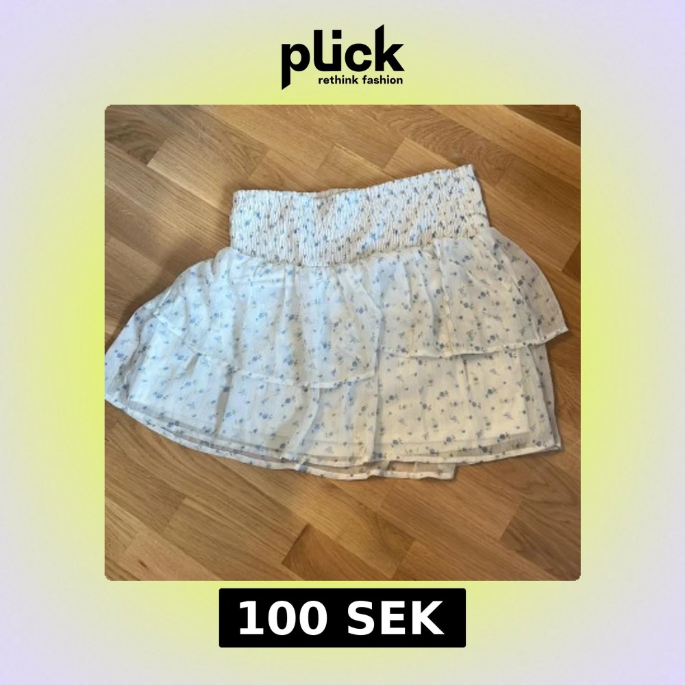 Supersöt kort kjol från Vero Moda i vitt med små blå blommor. Kjolen har bred smock i midjan och flera lager volanger som ger en luftig och romantisk känsla. Perfekt för varma dagar och lätt att matcha med en enkel topp.