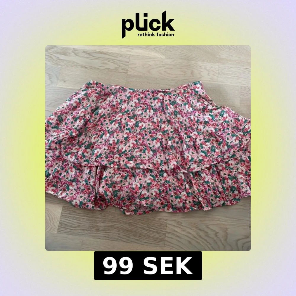 Supersöt kort volangkjol från Zara med blommigt mönster i rosa, rött, grönt och vitt. Kjolen har flera lager volanger som ger en flowy känsla och är perfekt för varma dagar. Tillverkad i ett lätt och luftigt material.