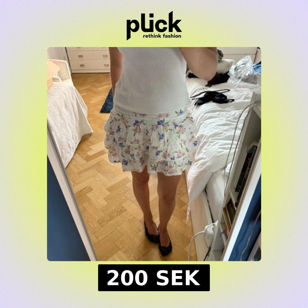 Supersöt kort kjol från Zara med volanger och blommigt mönster i lila, rosa, grönt och vitt.