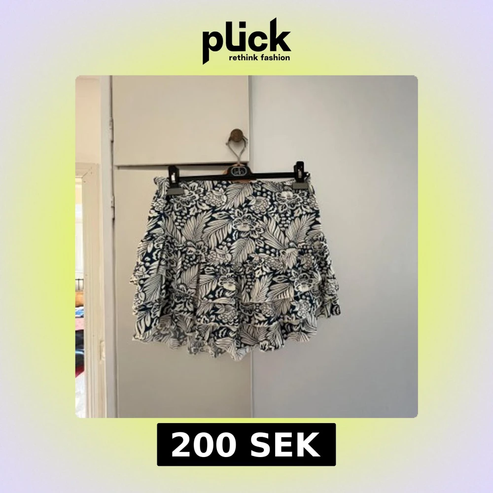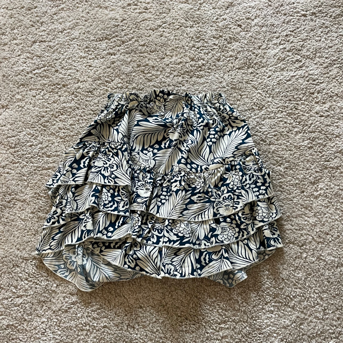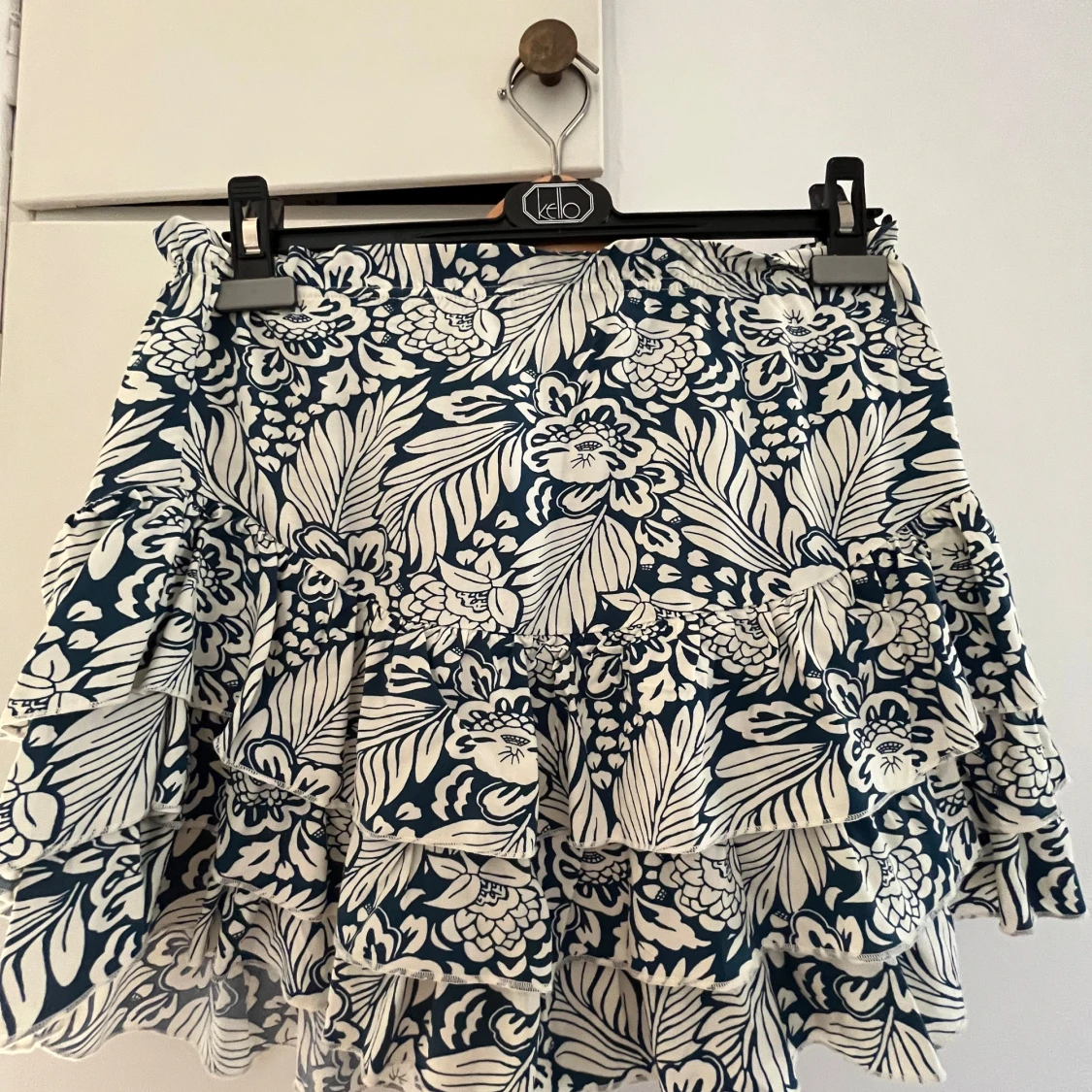 Supersöt kort kjol med blå och vitt blommönster och flera volanger. Kjolen har en flowy känsla och elastisk midja som gör den bekväm och lätt att bära. Har tyvärr inte kommit till användning..