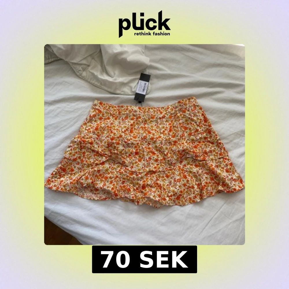 Supersöt kort kjol från Motel med blommigt mönster i orange, gult och vitt. Kjolen har volangdetaljer och dragkedja i sidan. Perfekt för sommarens alla tillfällen och lätt att matcha med en enkel topp.