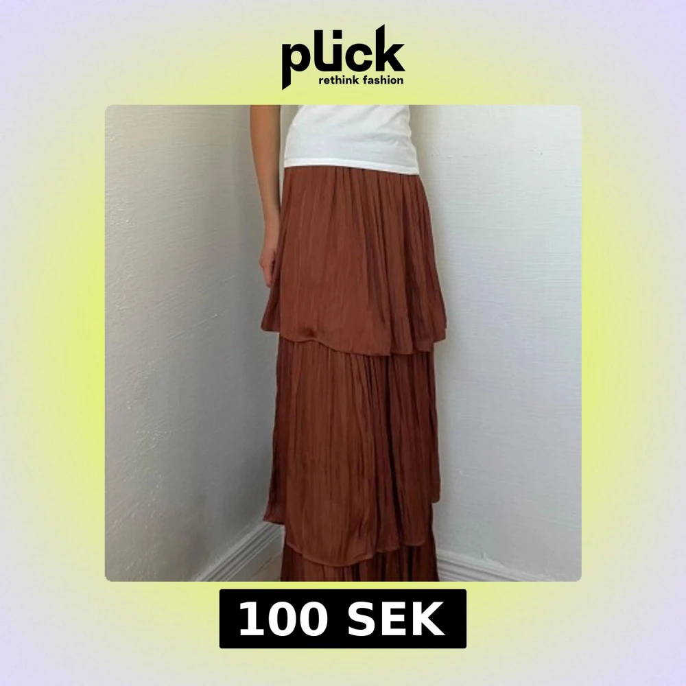 Säljer en brun festkjol i maxilängd från Mango🥭Kjolen har flera lager med volanger som ger en flowy känsla. Tyget är glansigt och kanelbrunt🟤⭐️