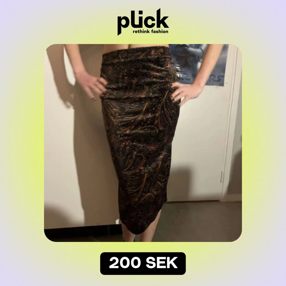 Stretchigt material speciellt i midjan, sammet. Fint mörkt mönstrade med svart bakgrund och orange krumelurer samt lite lila och blått. Lätt använd, inget slitage.