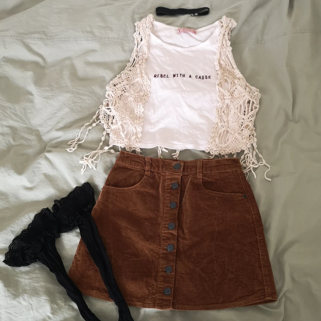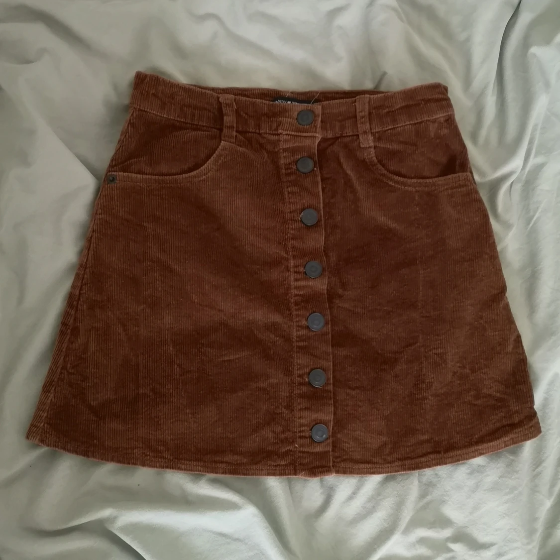 Fin ljusbrun manchesterkjol från Brandy Melville. 60cm i midjan, 37 cm lång. Lite stretchig. Den är för liten för mig därav ingen bild med den på. Toppen jag parat ihop den med är också till salu, se i profil.