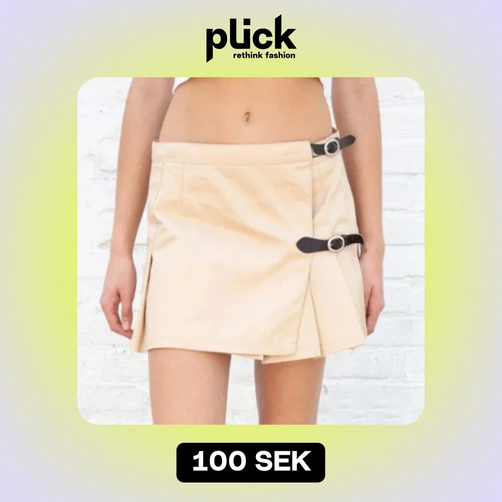 Jättefint kort brandy kjol, beige färg med svart läder spänne. Aldrig Andvänd, dock saknar denna kjolen det nedre läderbältet eftersom jag sprättade bort det för bättre passform. Men den är fortfarande lika fin. Storlek one size, passar xs-s