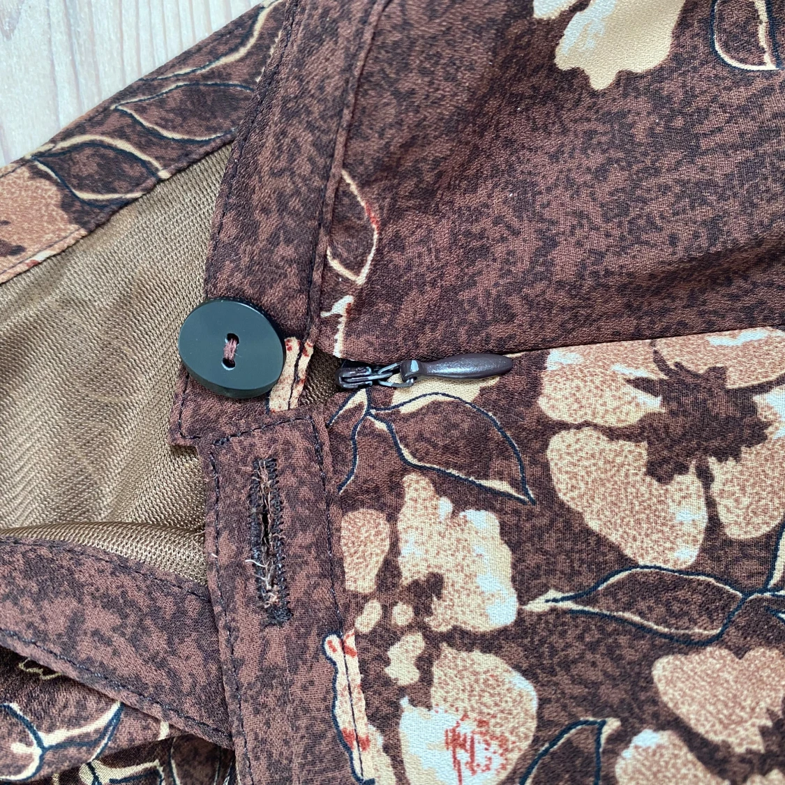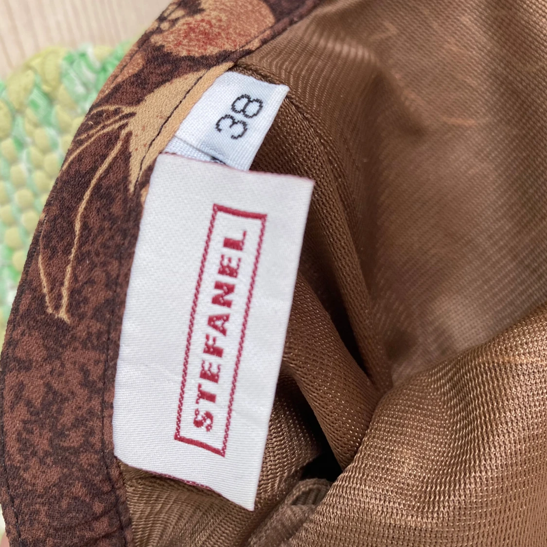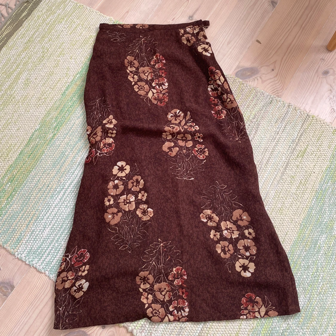 Säljer en brun långkjol från Stefanel med blommigt mönster i beun. Kjolen har en rak siluett, dragkedja och knapp i sidan för stängning. Materialet känns mjukt och har ett fint fall, perfekt för dig som gillar vintagevibbar och unika prints. Storlek 38/34
