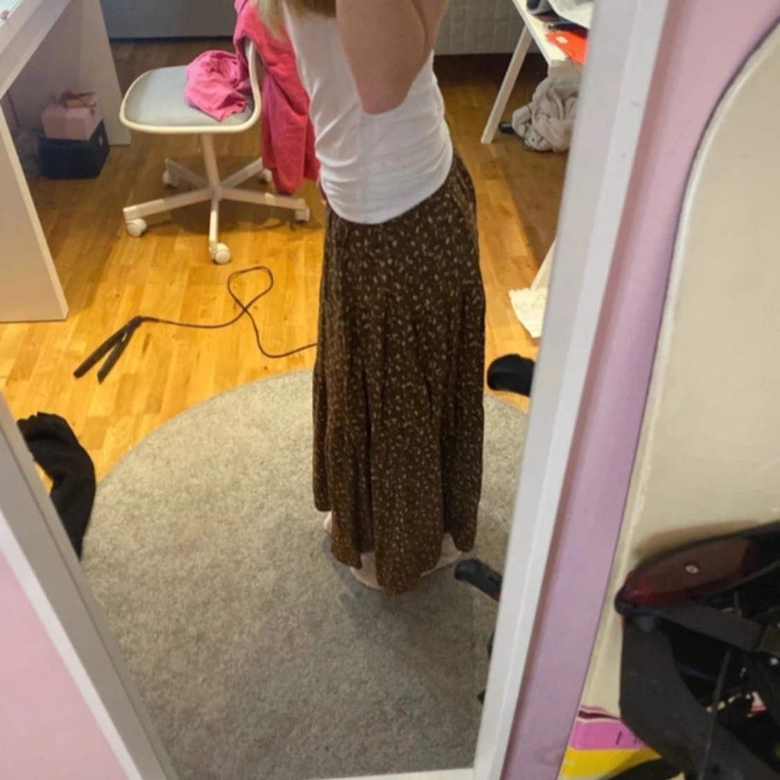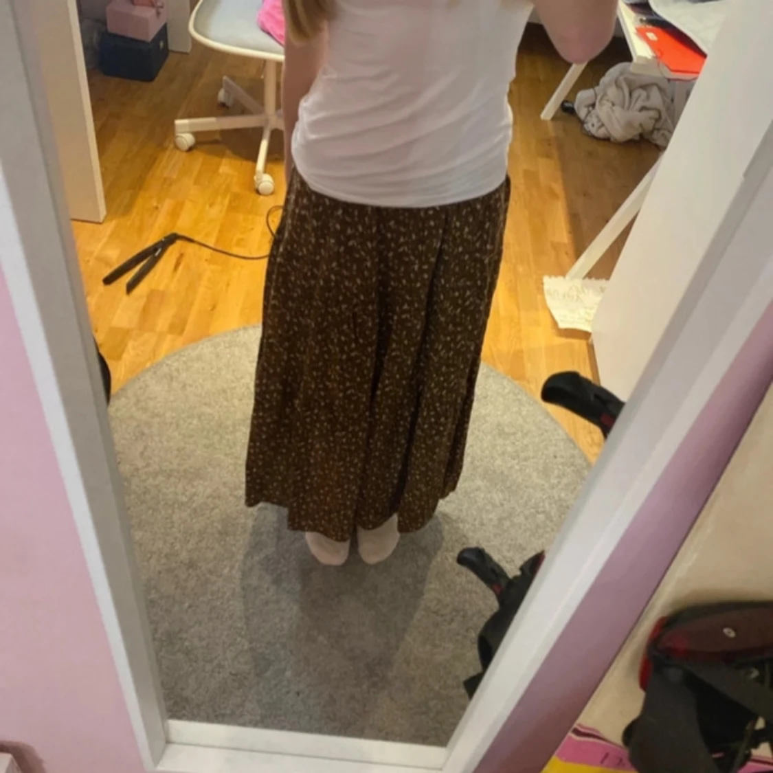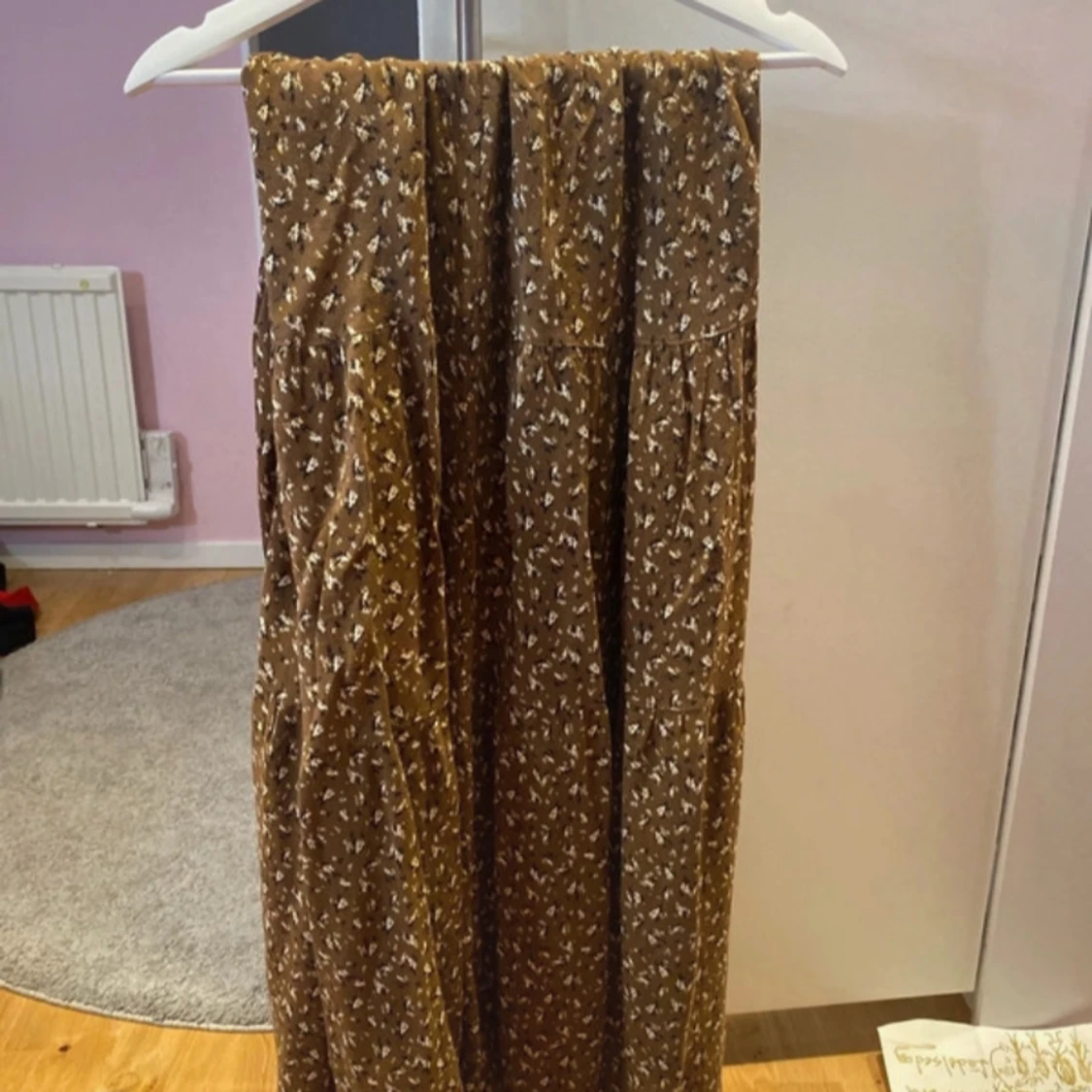 Säljer en fin brun långkjol med ett litet blommigt mönster. Kjolen har en luftig passform och är perfekt för en avslappnad stil. Den är lätt att matcha med olika toppar och accessoarer.