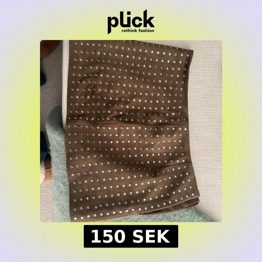 Säljer en ny aldrig använd brun kjol med silvriga nitar över hela tyget. Kjolen har en rak passform och är tillverkad i ett mockaliknande material. Större storlek så den passade mig perfekt lowrise. Super gullig för sommarfest!